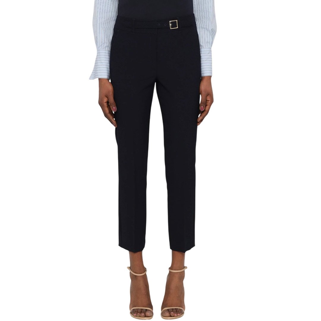 These stretch pants will go with the flow and can be used as part of countless looks. The waistband adds a personalized touch. The polyester used for this piece is derived from recycled plastic material Stretch canvas trousers with a viscose blend Straight fit Belt fastening with a metal buckle Slanted side pockets and back welt pockets Pressed pleat detail on the front and back