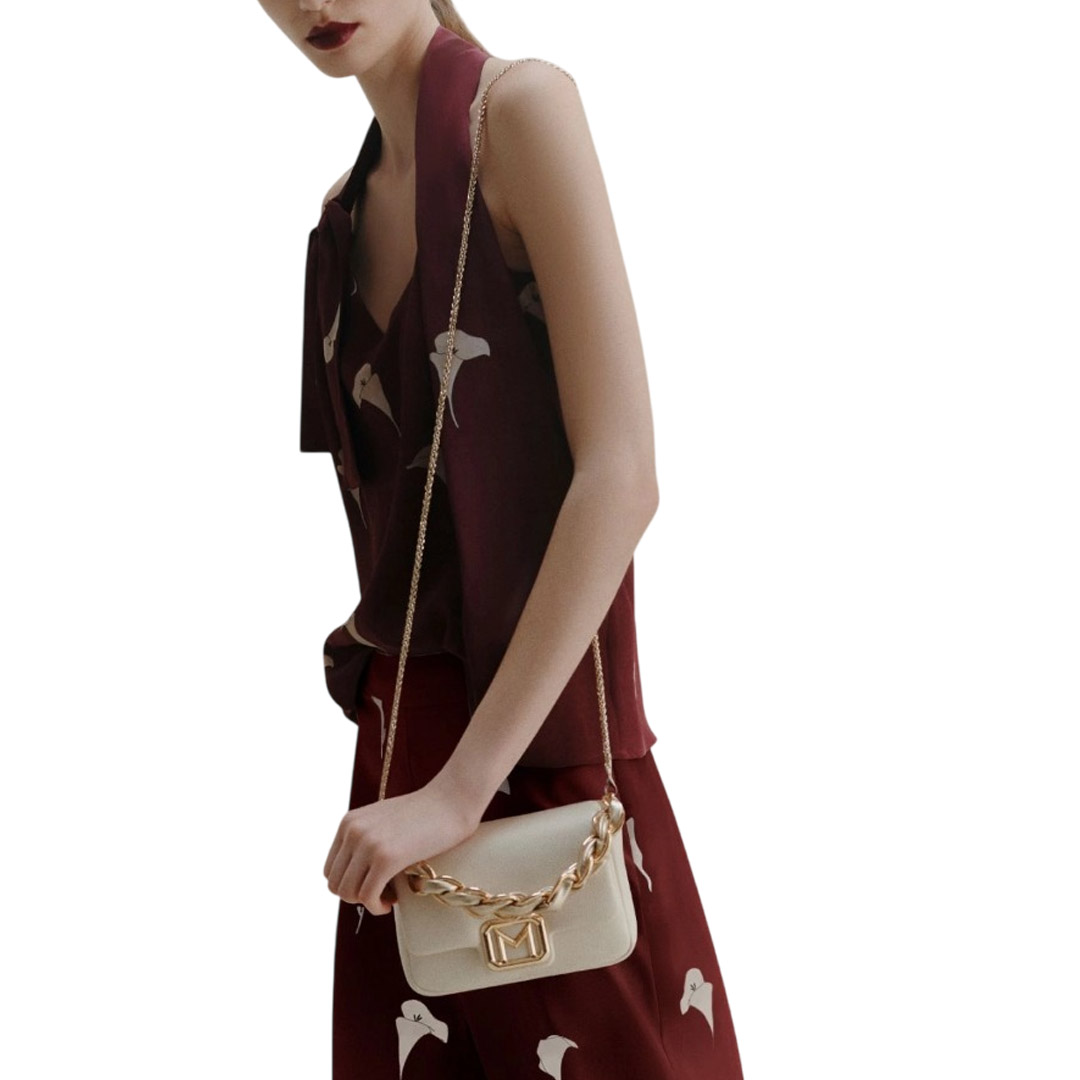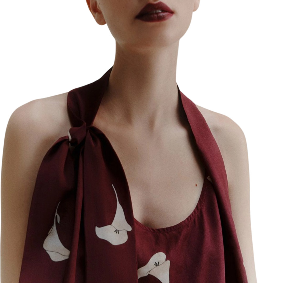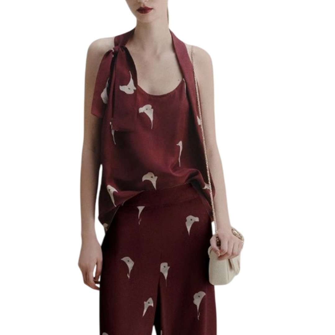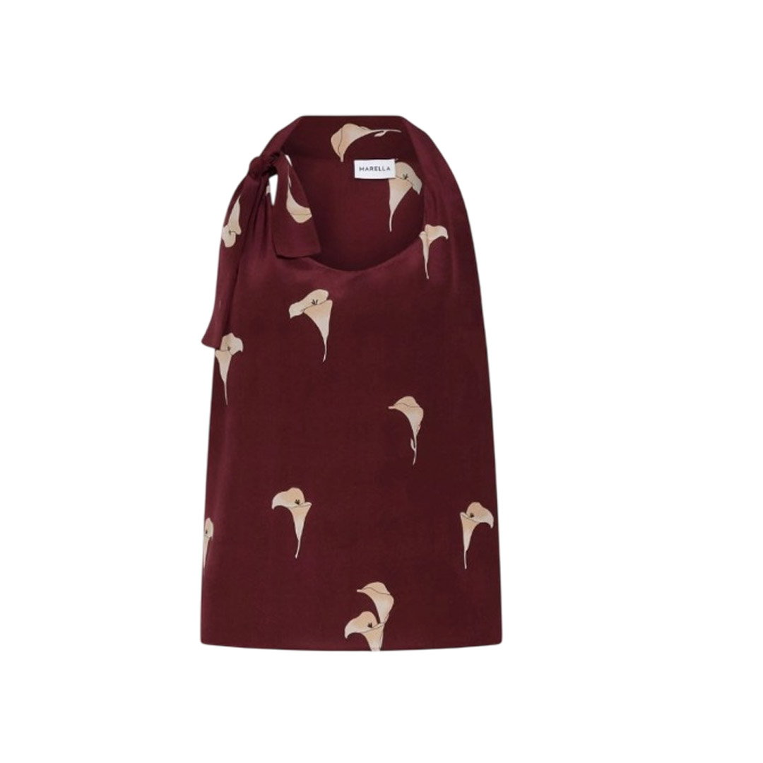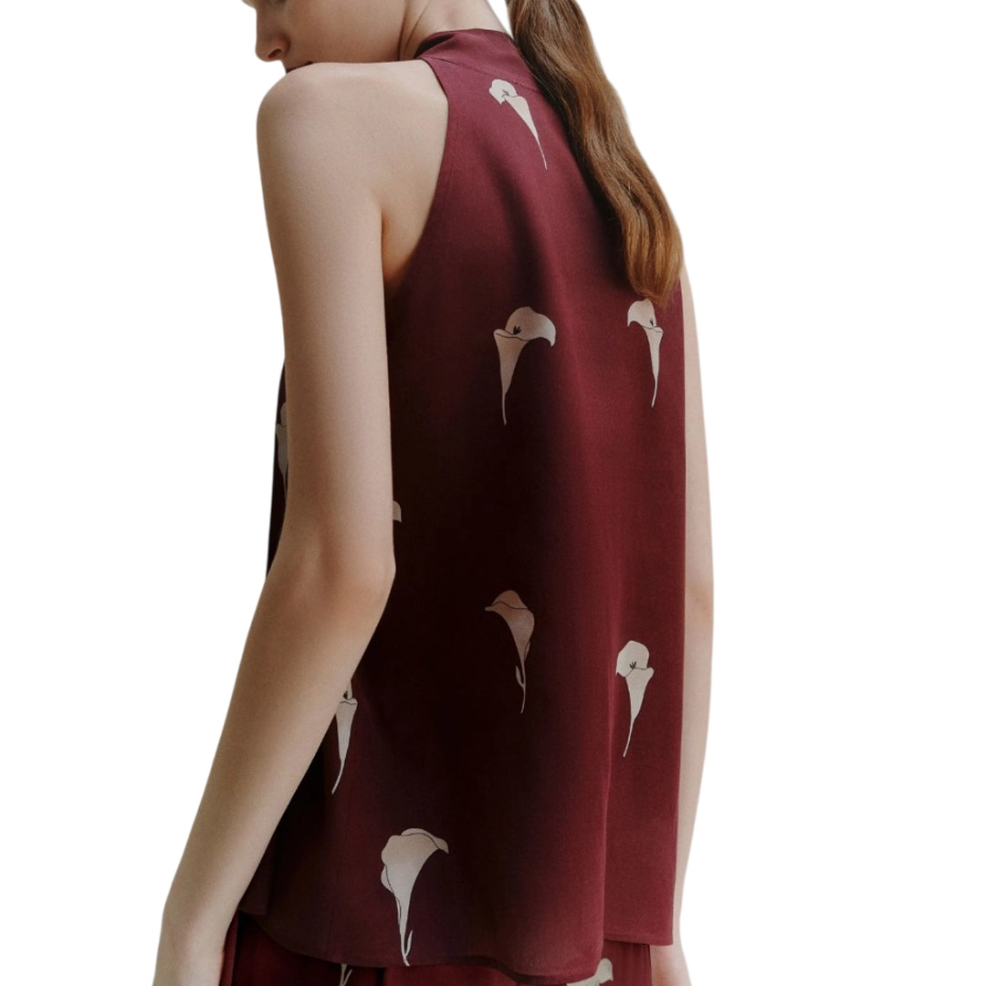 Soft organic shapes on pure silk sway in a delicate dance: impossible to resist the charm of the new top, with a wide neckline and a sash to tie on the shoulder for an even more original look. Printed pure silk crêpe de Chine top. Loose fit. Round neck. Sash to tie on the right shoulder. Sleeveless model.
