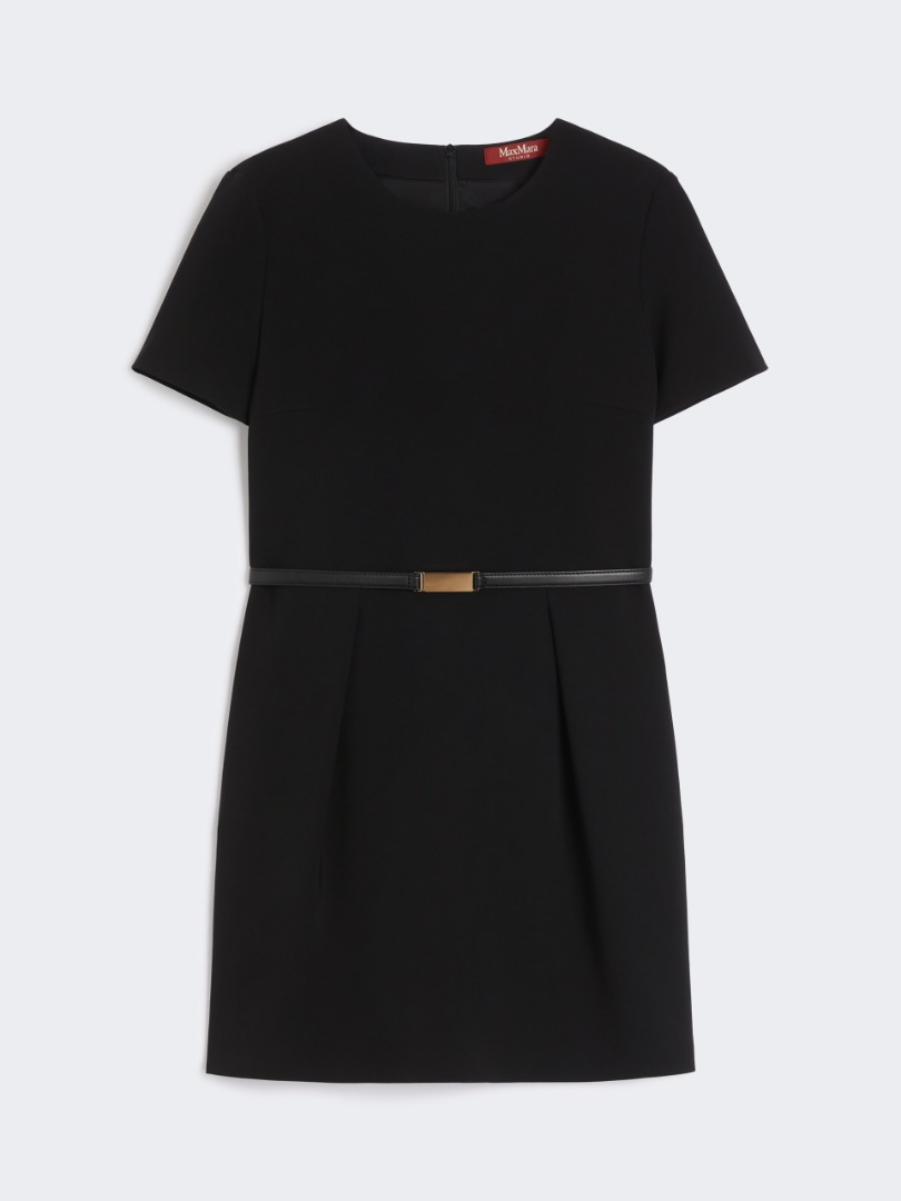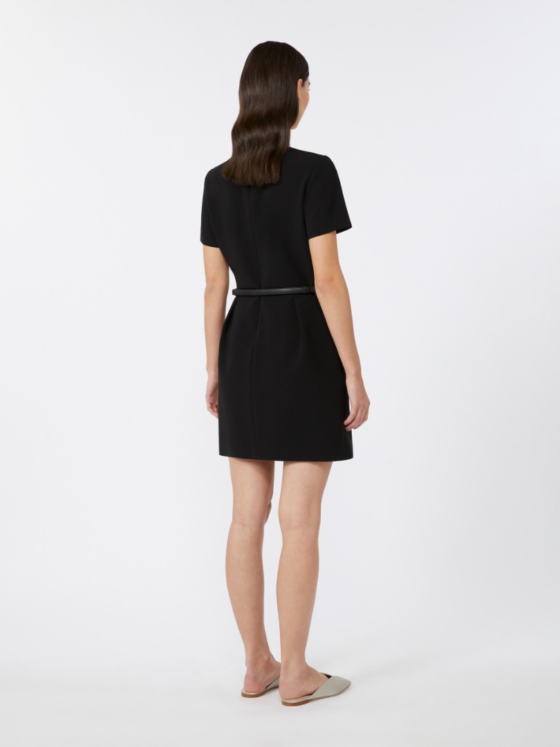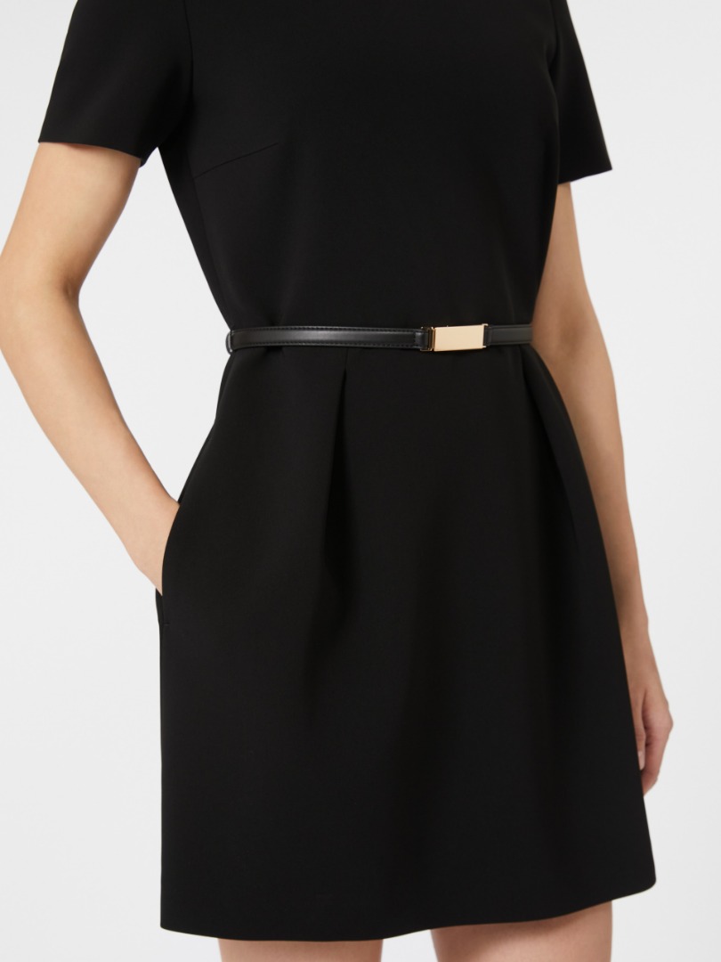 Short dress with tulip skirt, high waist and shaded pleats that add volume. Cady dress. Crew neck. Short set-in sleeves. Zip fastening on the back. Inset pockets on the sides. Matching belt in coated fabric. Lined.