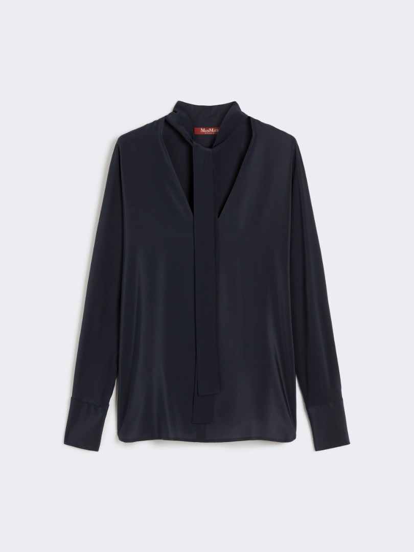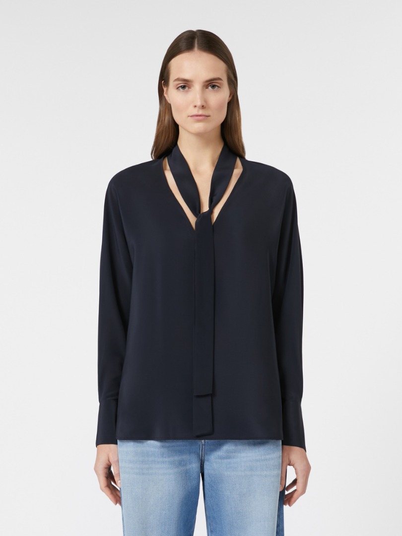 Blouse with a tie-style sash to tie at the neck. Pure silk crêpe de Chine blouse. Soft fit. V-neck. Wide, long kimono sleeves. High shirt cuffs with double jewel buttons. Rounded hem with side slits.