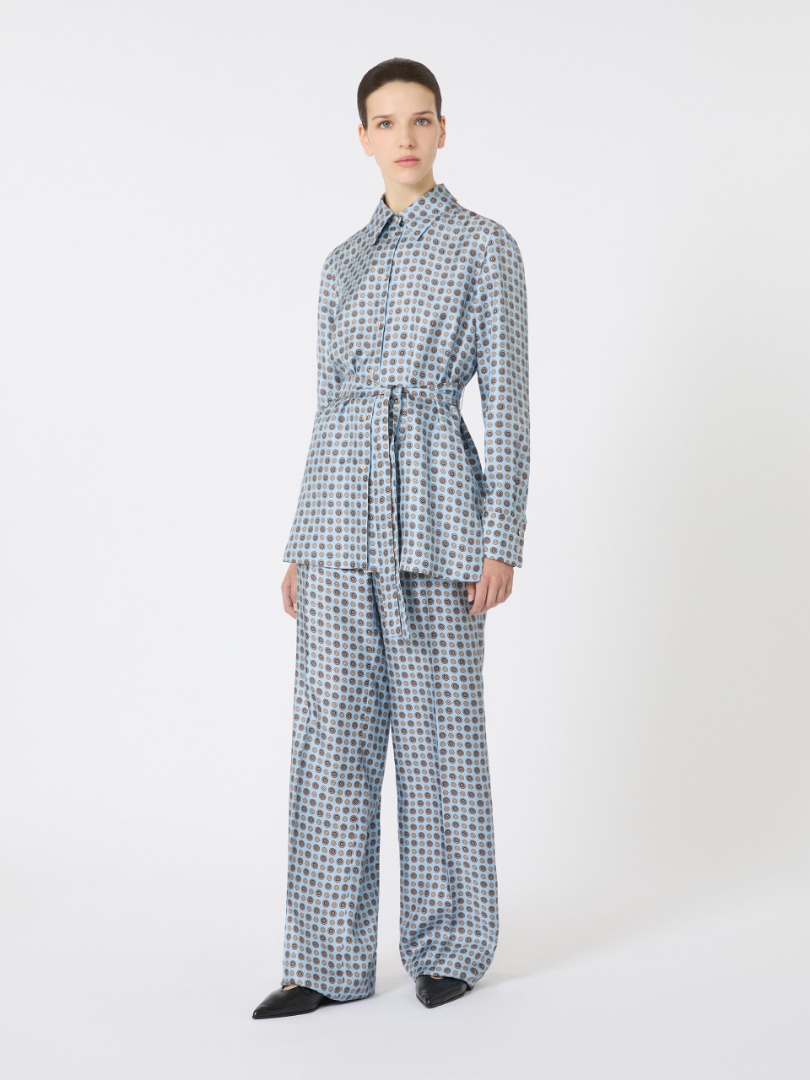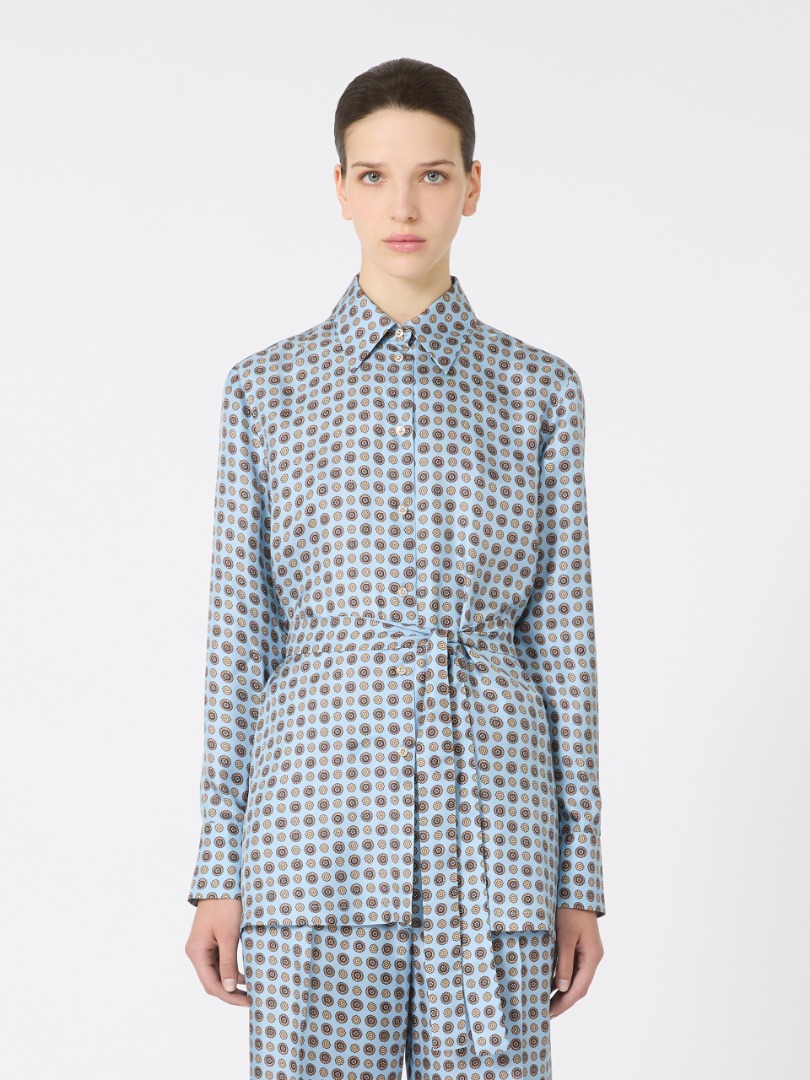 Shirt with a belt tied at the waist to highlight the silhouette. Printed pure silk twill shirt. Straight fit. Pointed collar. Long set-in sleeves with cuffs and side button. Front closure with jewel buttons. Small square side slits.