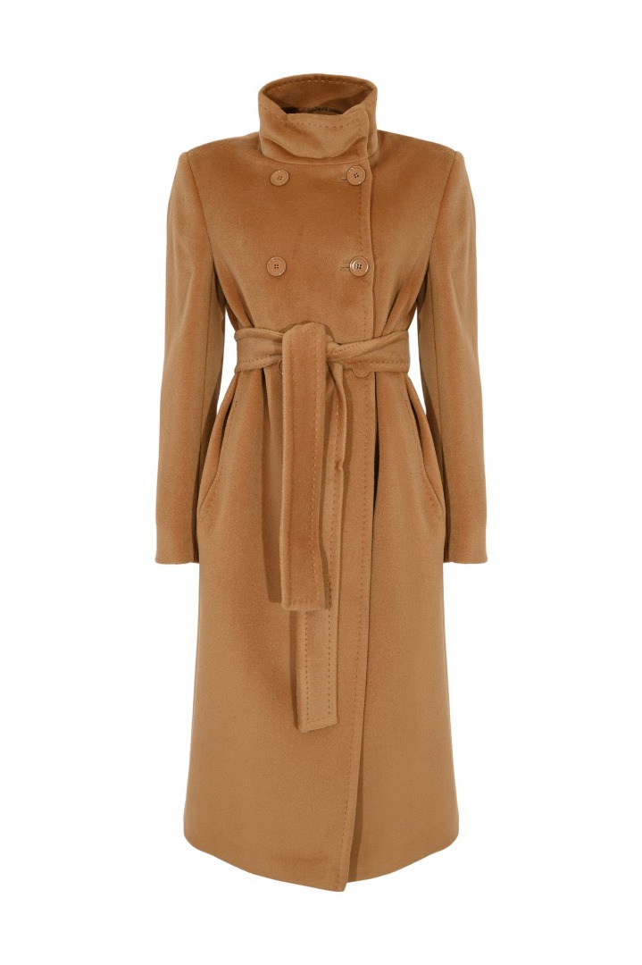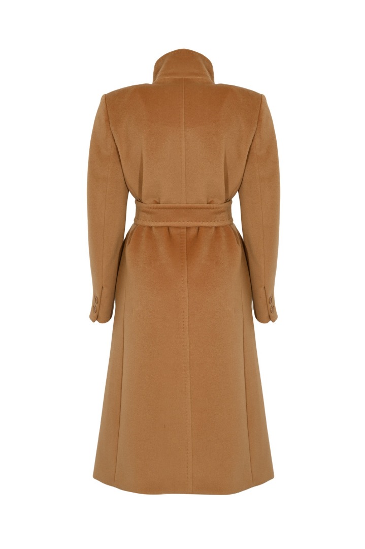 The women's Arezzo camel coat features an elegant and timeless design. It features a double-breasted button closure and a matching tie belt that flatters the figure. It has a high collar and long sleeves with buttoned cuffs. The straight and refined fit is perfect for a formal or chic everyday look in the colder seasons.