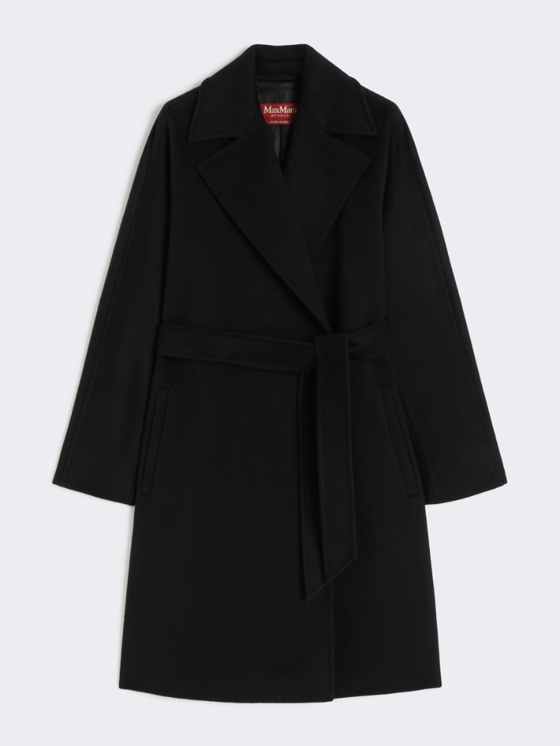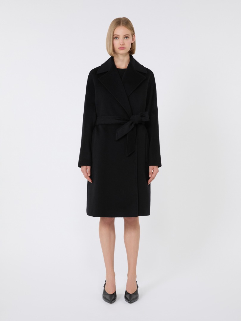 Midi robe coat, entirely finished with sartorial stitching. Pure wool drap coat. Flared line. Important lapel collar. Long kimono sleeves. Robe closure with matching belt. Welt pockets on the sides. Lined.