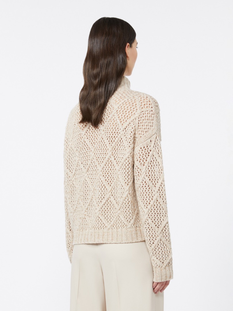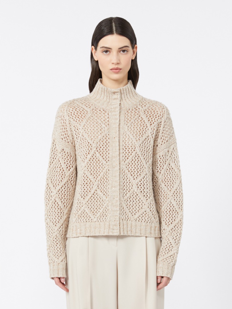 Wool and cashmere cardigan enriched with an all-over sequin embroidery that gives the garment brightness. The ribbed knit defines the collar, cuffs and edges. Wool and cashmere yarn cardigan. Comfort fit with a relaxed silhouette. Ribbed turtleneck. Long set-in sleeves. Front closure with hidden buttons, ribbed cuffs and hem. Diamond and mesh pattern inside.