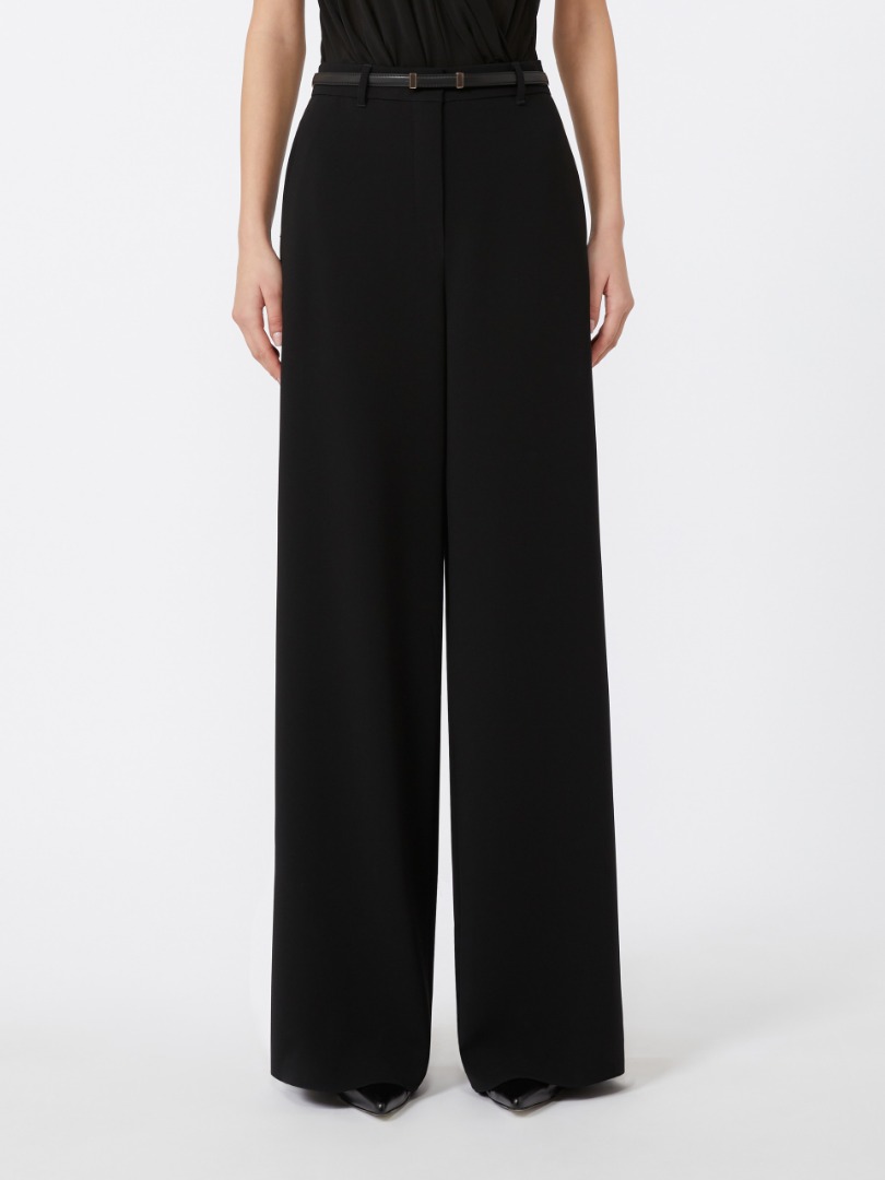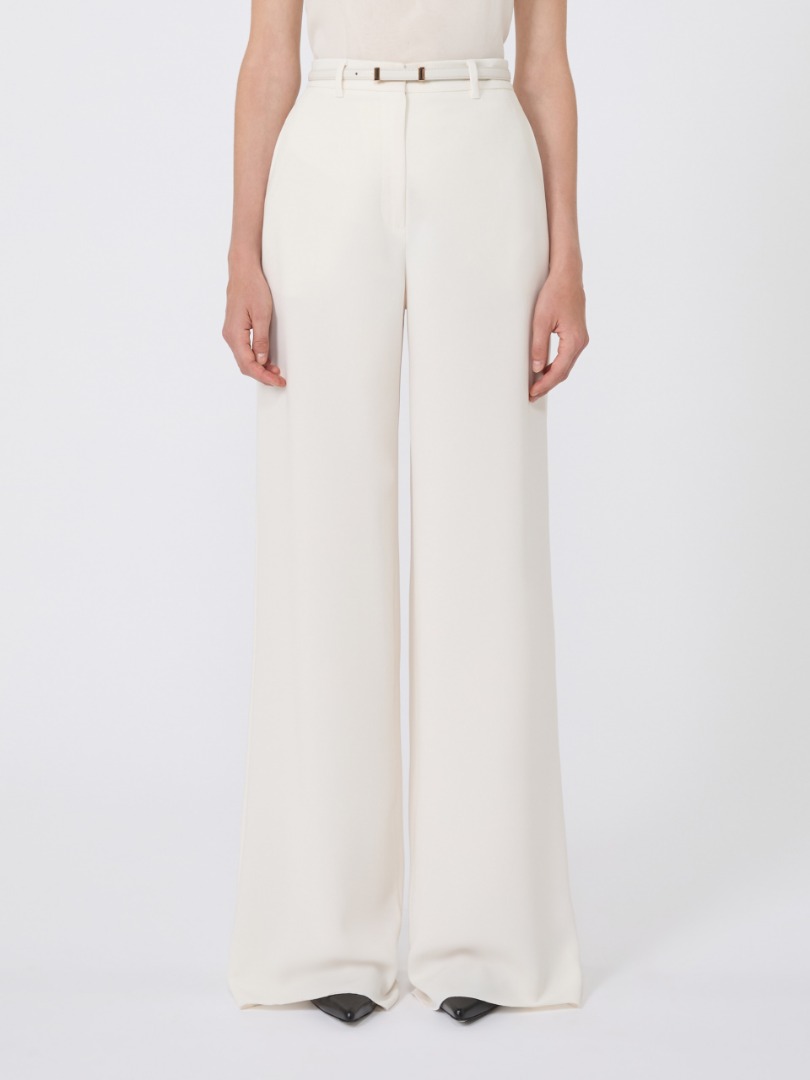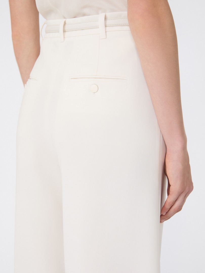 Flowing trousers with matching coated fabric belt. Cady trousers. Wide leg. High waistband closure, zip fly and hook. French pockets on the sides. Double welt pockets with button on the back.