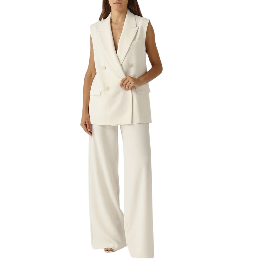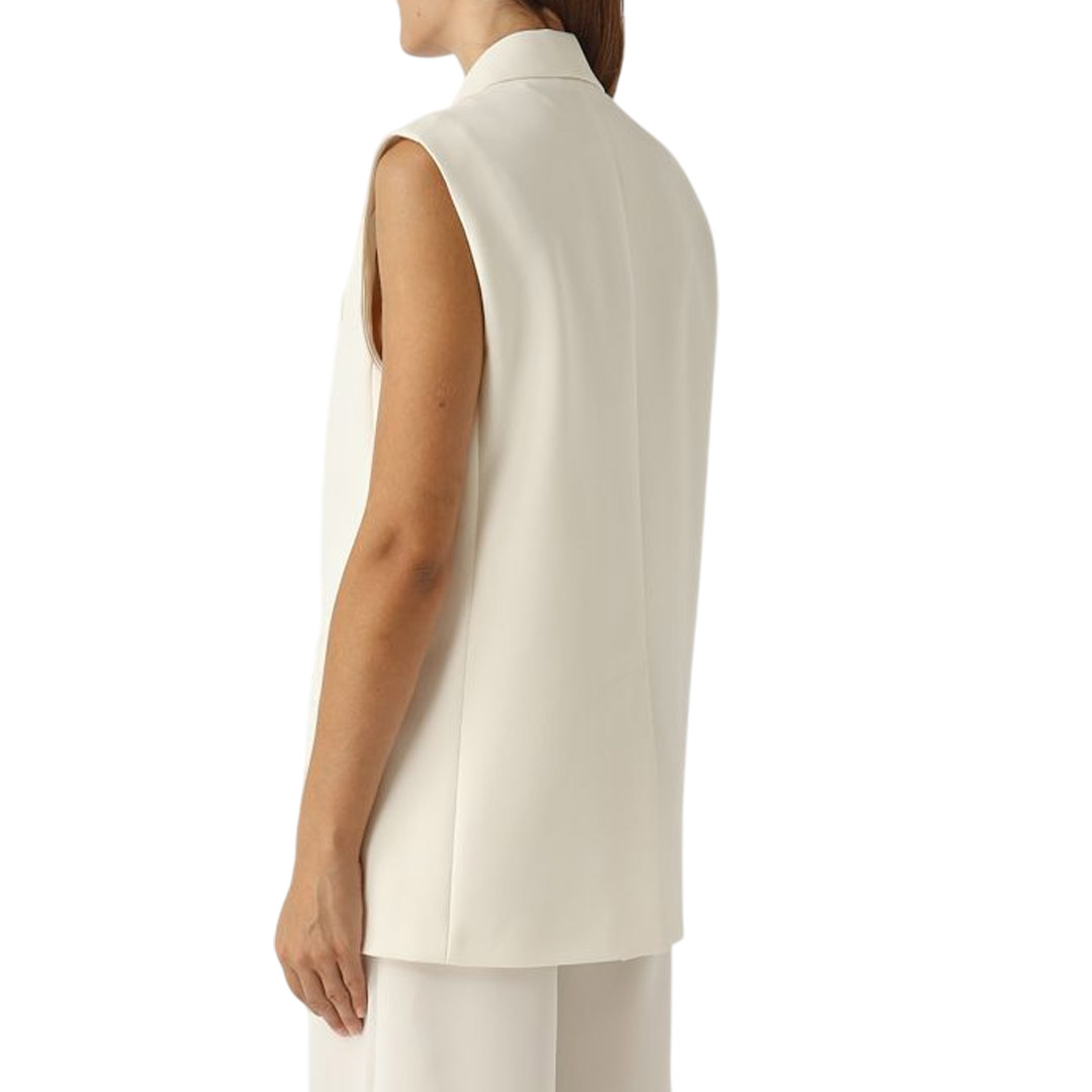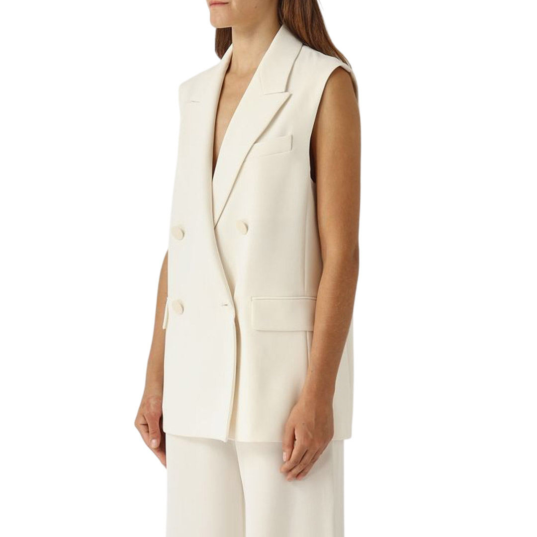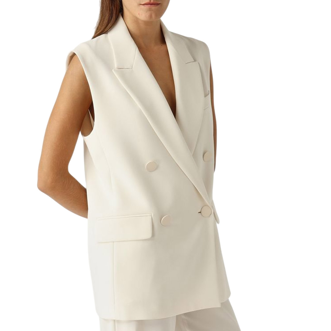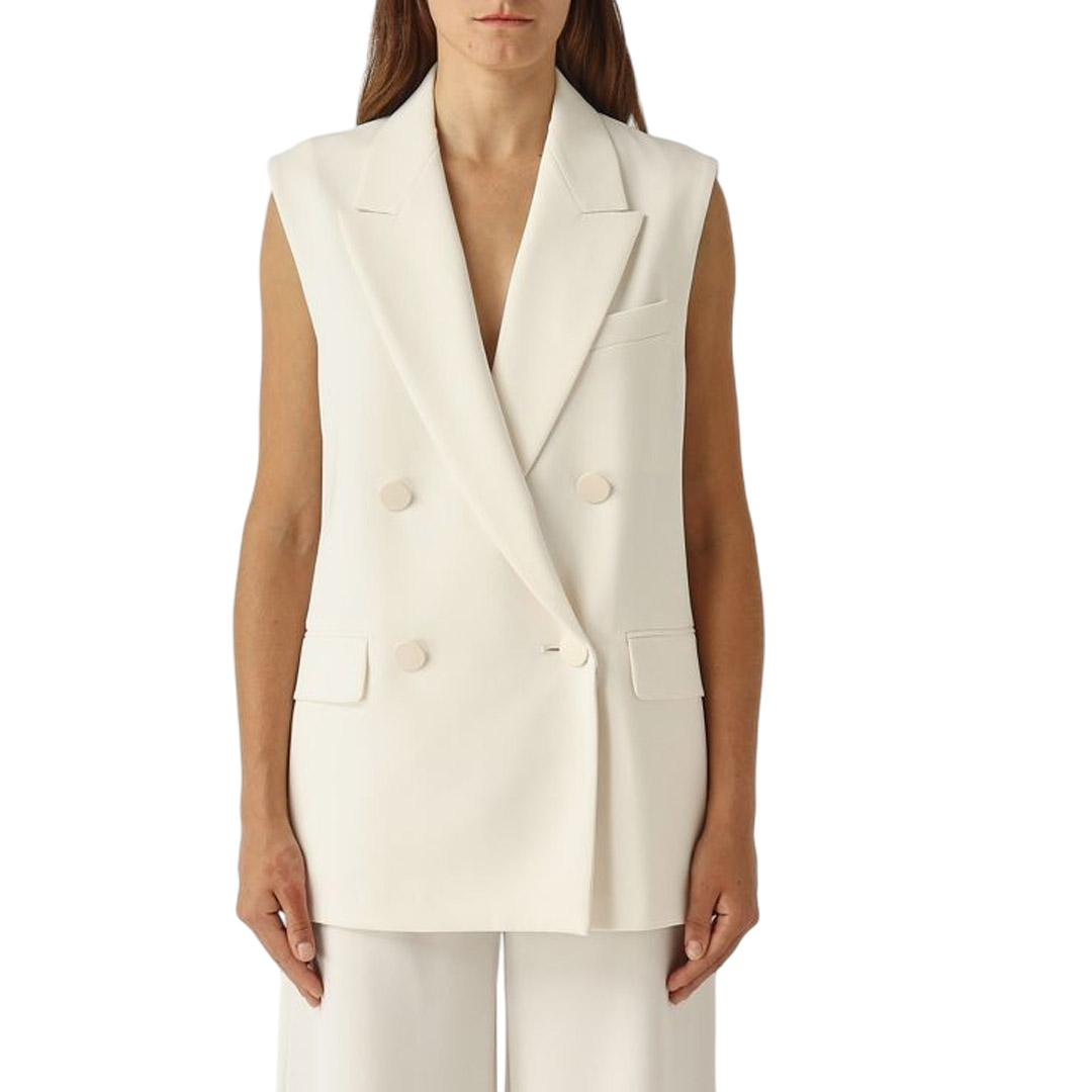 - sleeveless, classic lapels - Double-breasted fastening with tone-on-tone buttons - two flap pockets on the front - covered buttons, back vent - lined