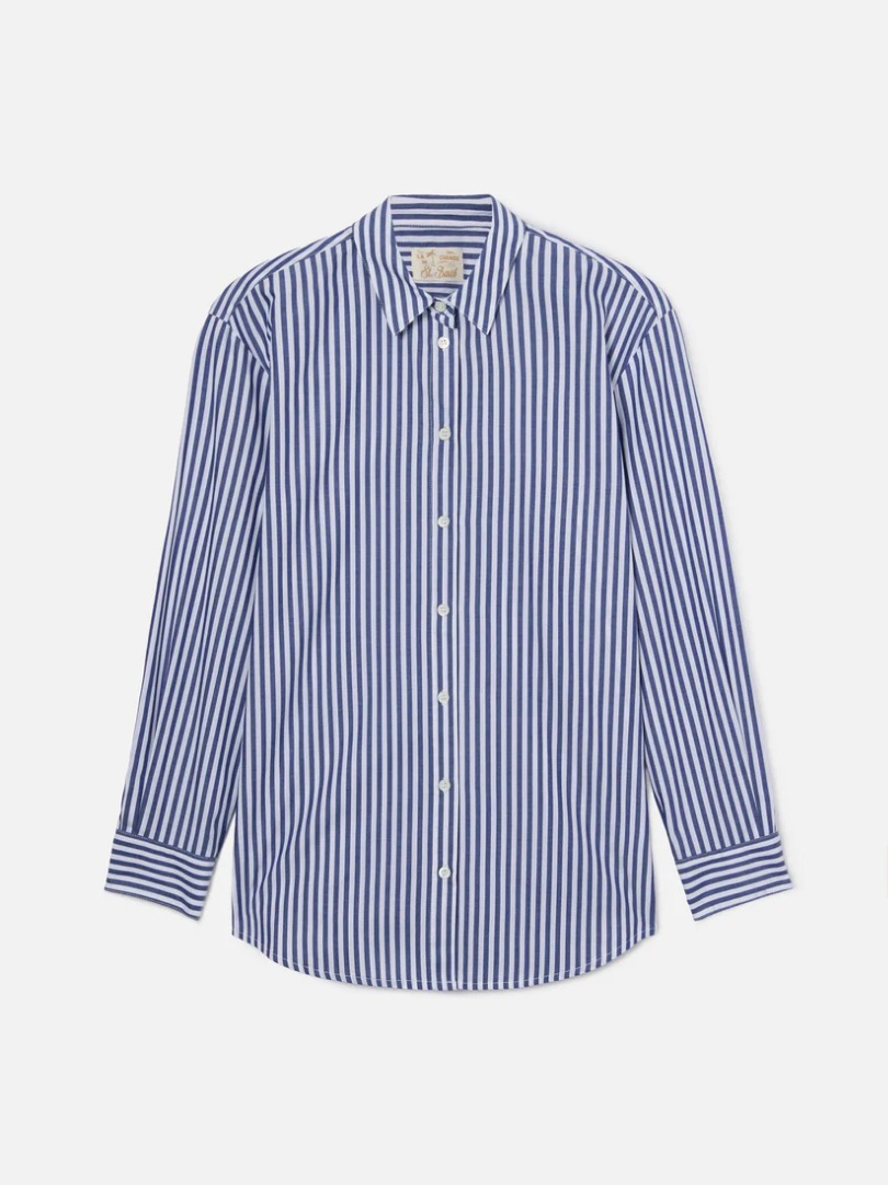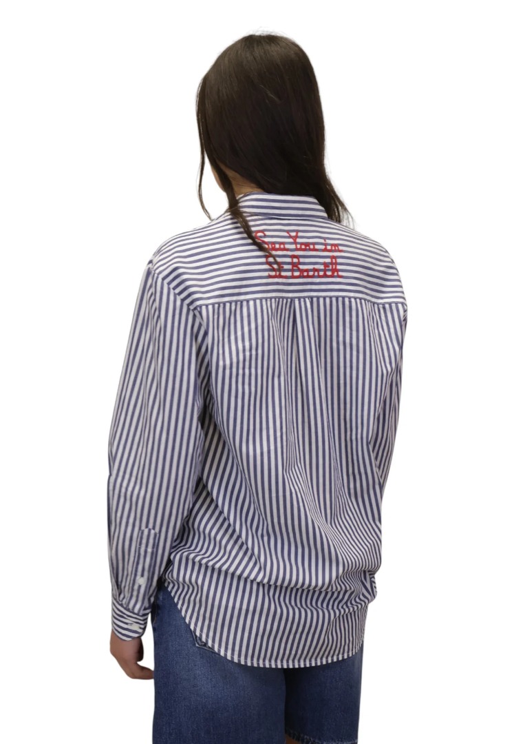 The Brigitte shirt is made of pure cotton poplin, a lightweight and breathable fabric designed to offer comfort and freshness. The vertical striped design in blue and white defines the garment with a distinctive graphic aesthetic. The model features a classic collar and front buttoning with logo buttons. The garment is completed by the contrasting See You In Saint Barth embroidery on the back and the central pleat on the back that defines the structure of the model. The oversized line is designed for a comfortable and relaxed fit. Brigitte Shirt Pure cotton poplin Blue and white Vertical striped pattern Classic collar Front buttoning Logo buttons Contrasting See You In Saint Barth embroidery on the back Central pleat on the back Long sleeves