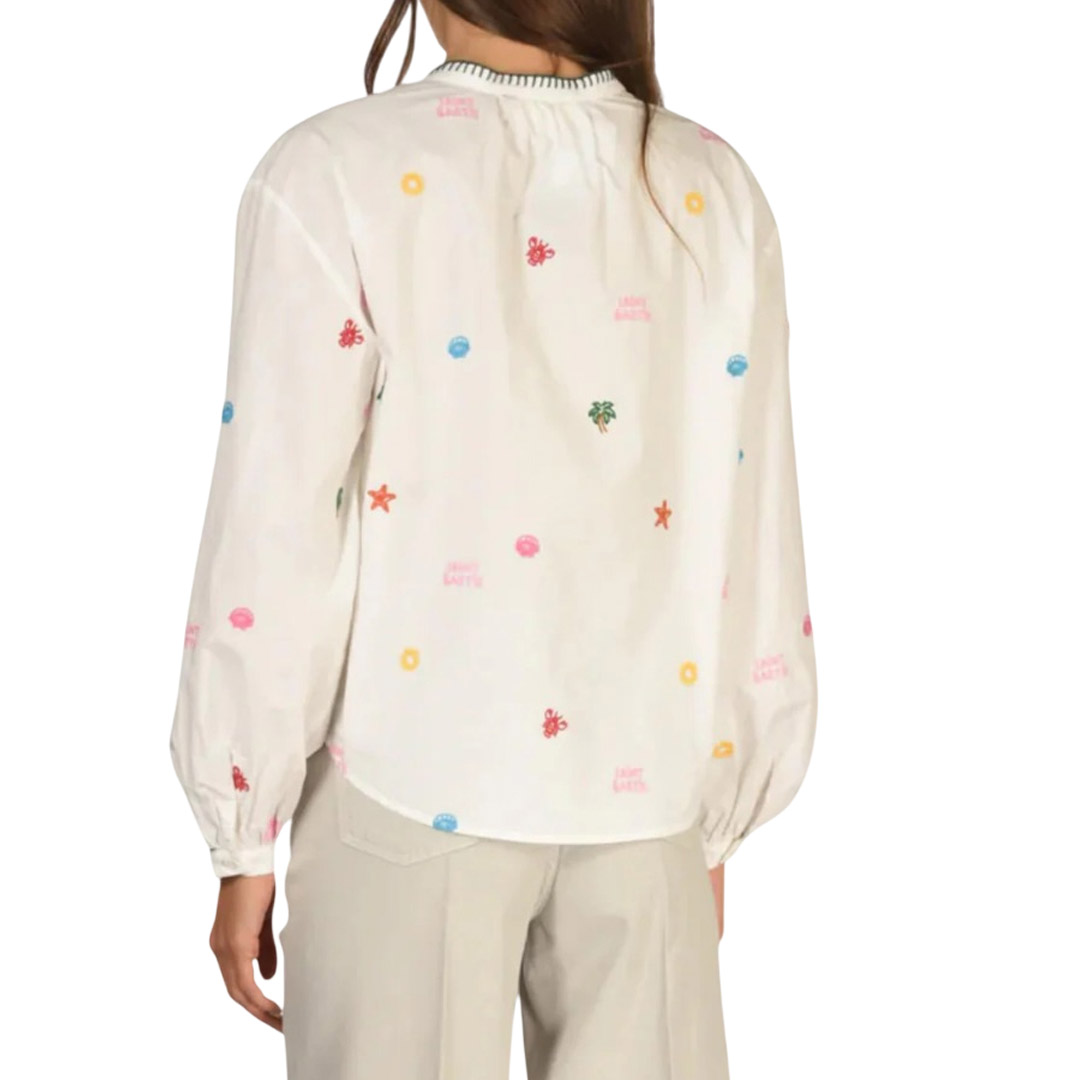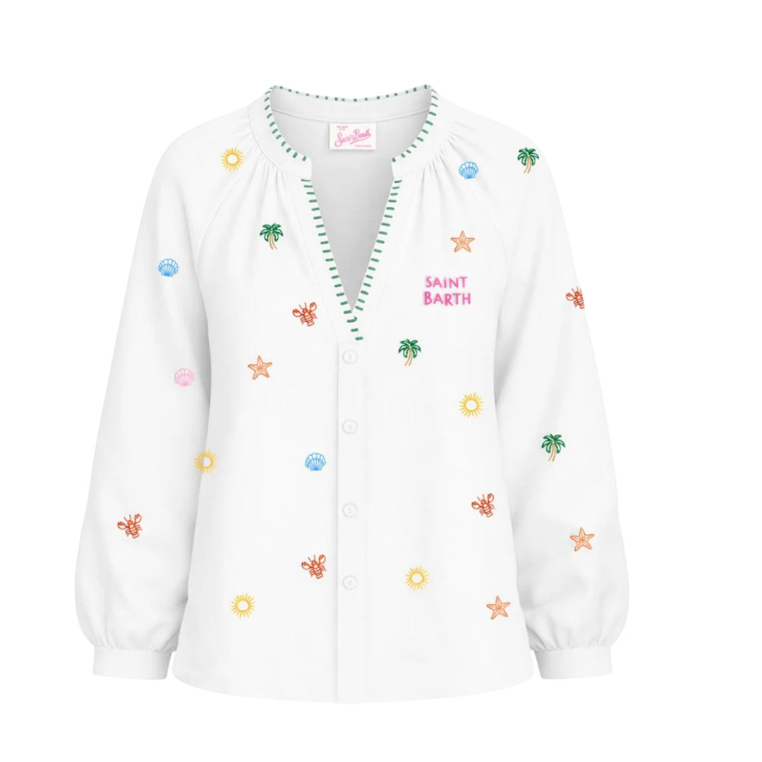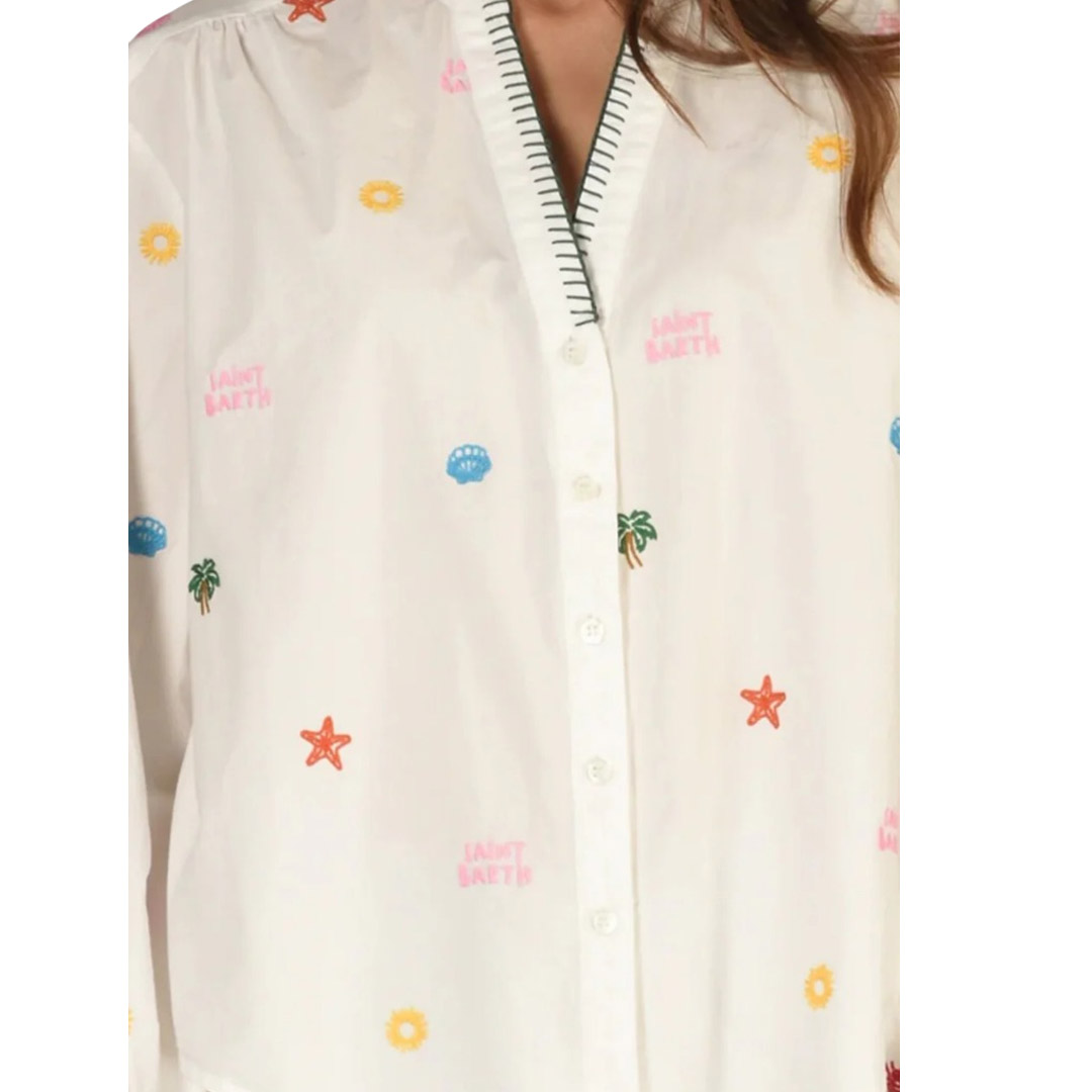 This MC2 Saint Barth shirt combines sophistication and practicality in a perfect summer garment. The all-over contrasting embroidery adds character and enhances the design, making it ideal for refined yet relaxed outfits. The lightweight cut makes it perfect for wearing with linen trousers, denim, or skirts, easily adapting from day to night. A versatile option that adds personality without sacrificing comfort, designed for everyday wear and informal occasions with a sophisticated touch. • Women's shirt • Mandarin collar with contrasting embroidery • Henley neckline • Central button closure • All-over contrasting embroidery on front and back • Long sleeves • Cotton • Ruffled cuffs