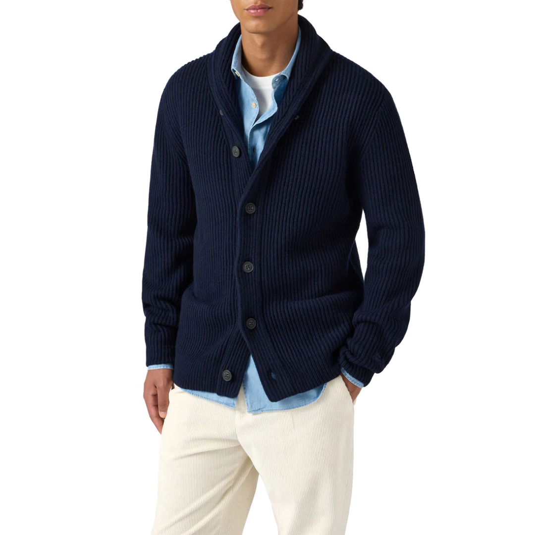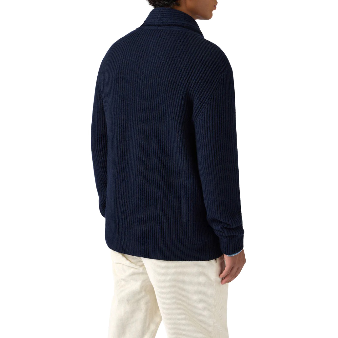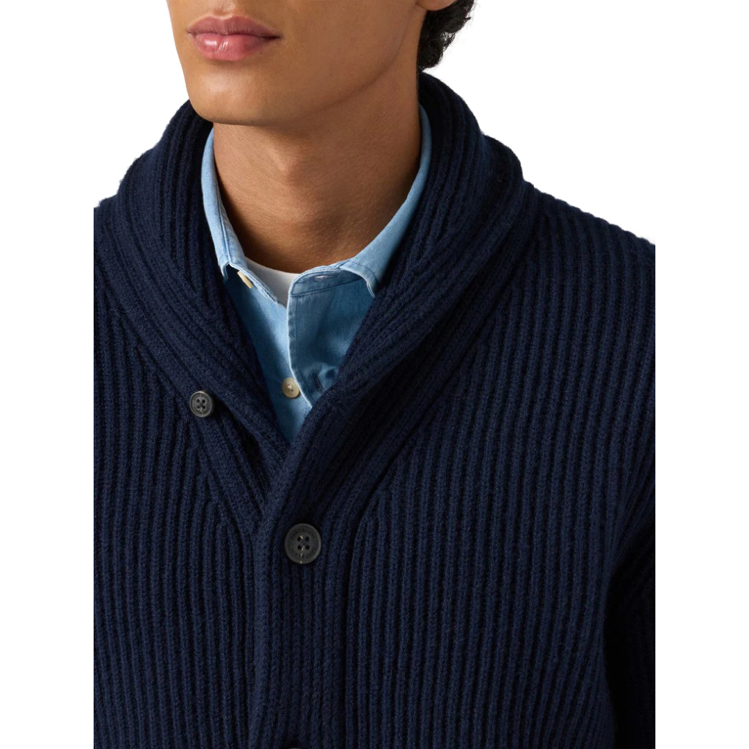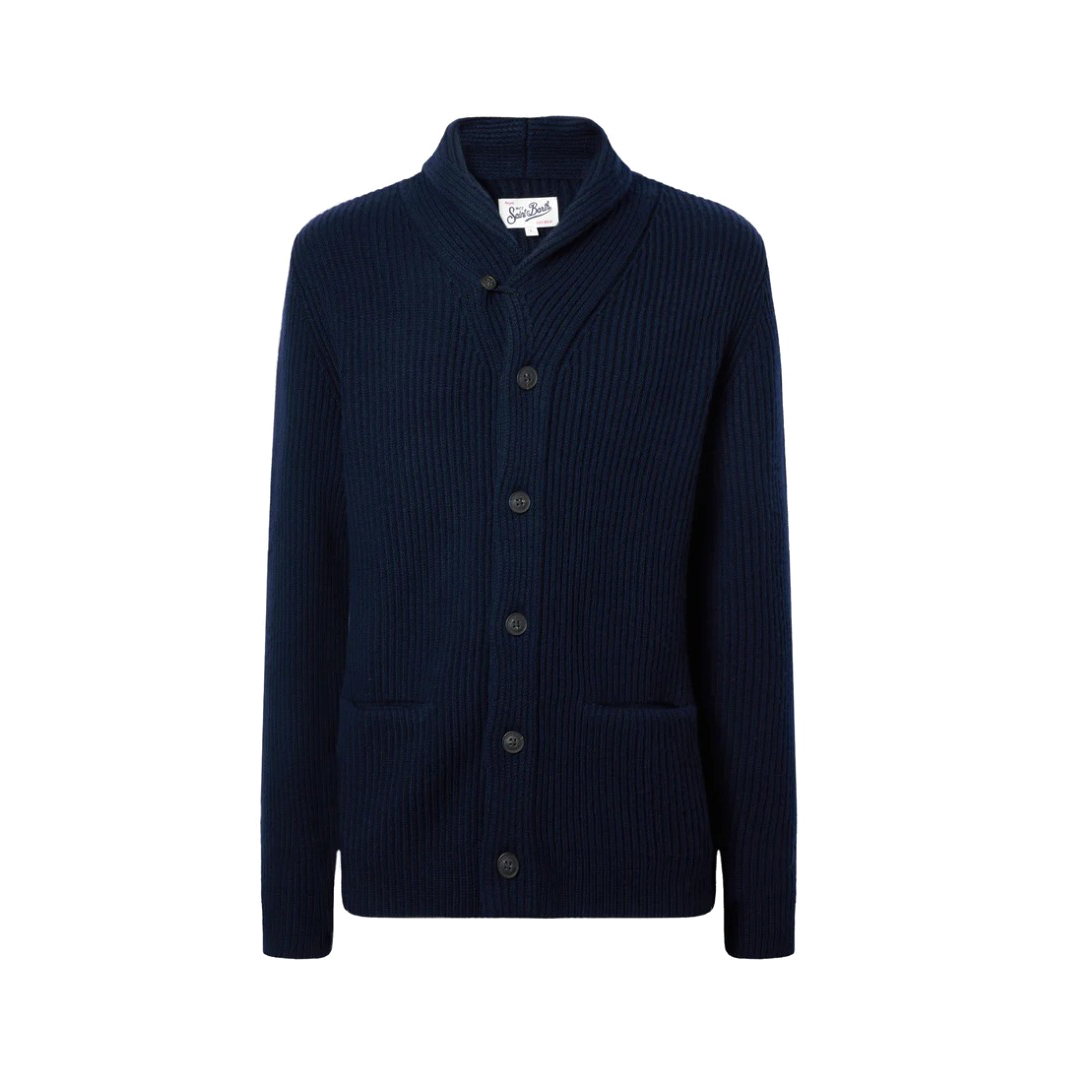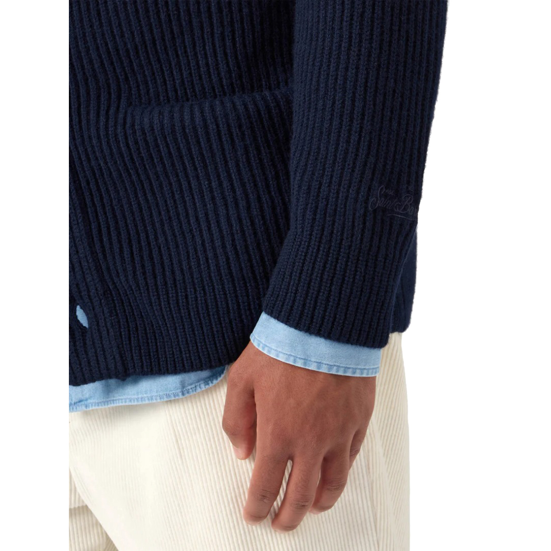Cardigan Ribbed knit fn. 5 Carded merino wool Shawl neck Solid midnight blue Long sleeves Ribbed hem and cuffs Regular fit St.Barth cuff embroidery Button opening