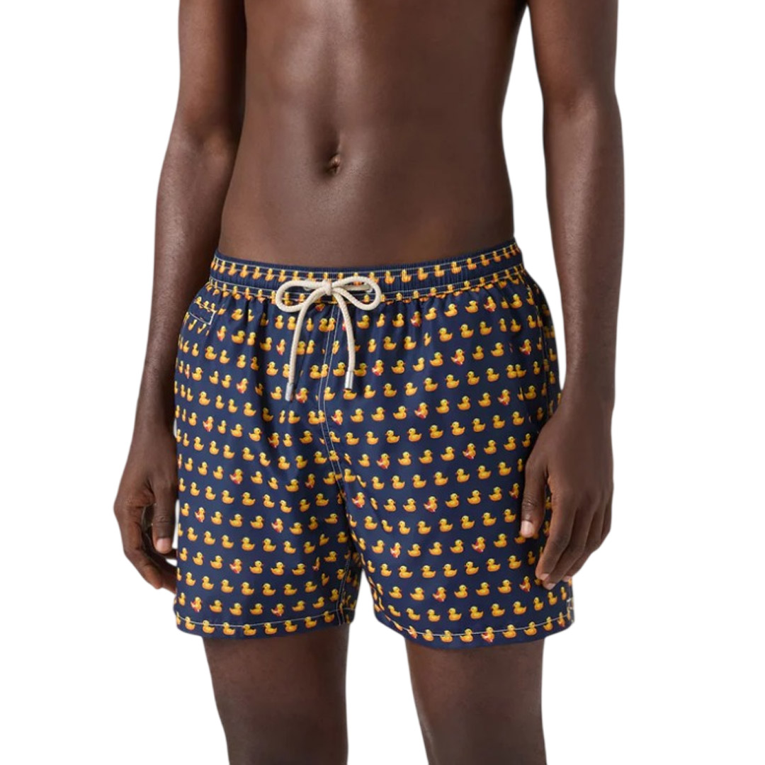 The Lighting Micro swimsuit is made of breathable, quick-dry fabric designed for comfort and freedom of movement. The navy design features an all-over print with iconic contrasting yellow ducks that give the model a playful and recognizable graphic aesthetic. The elasticated waist with drawstring allows for easy adjustment of the fit, while functional pockets and thoughtful details complete the construction. The internal antibacterial stretch mesh ensures comfort during use. The model has a medium length and regular fit. Lighting Micro swimsuit Breathable, quick-dry fabric Navy All-over print with ducks Medium length Elasticated waist with drawstring Waist adjustment drawstring with logoed knot cover Side welt pockets Welt coin pocket Internal back welt pocket with button closure Side slits Logoed metal eyelets Nickel-free metal accessories Internal pocket Internal antibacterial stretch mesh Regular fit