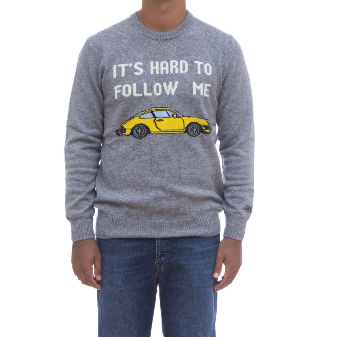 Crew neck wool sweater. Ribbed collar, cuffs, and hem. Embroidery on the chest. "SAINT BARTH" embroidered on the cuff.