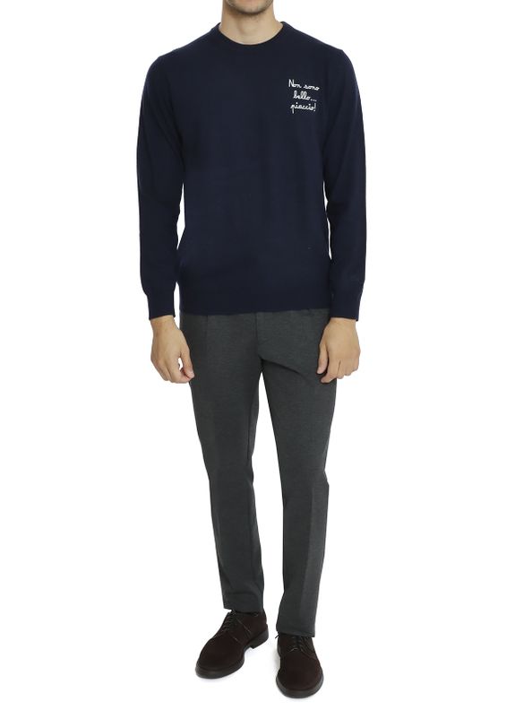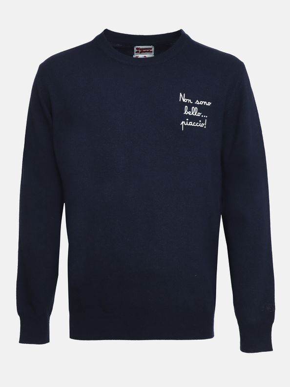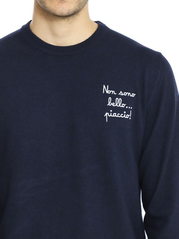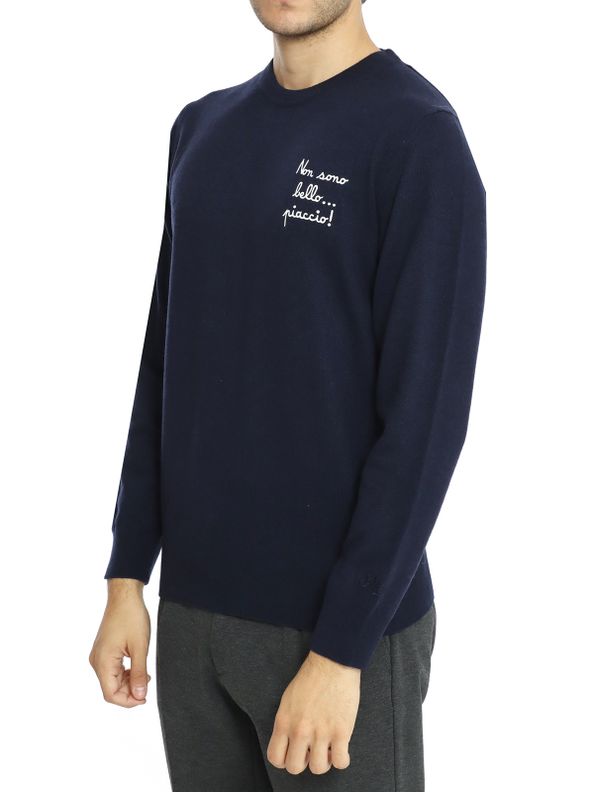 Crew neck sweater with heart stitch embroidery "I'm Not Handsome". I like the Heron model from the limited edition "Vacanze di Natale" collection for men by Mc2 Saint Barth. Crew neck sweater in wool blend. Heart stitch embroidery "I'm Not Handsome". I like the Heron model. Sweater from the limited edition "Vacanze di Natale" collection by Natal3. Tone-on-tone embroidered logo on the wrist. Ribbed collar, hem and cuffs. Regular fit.
