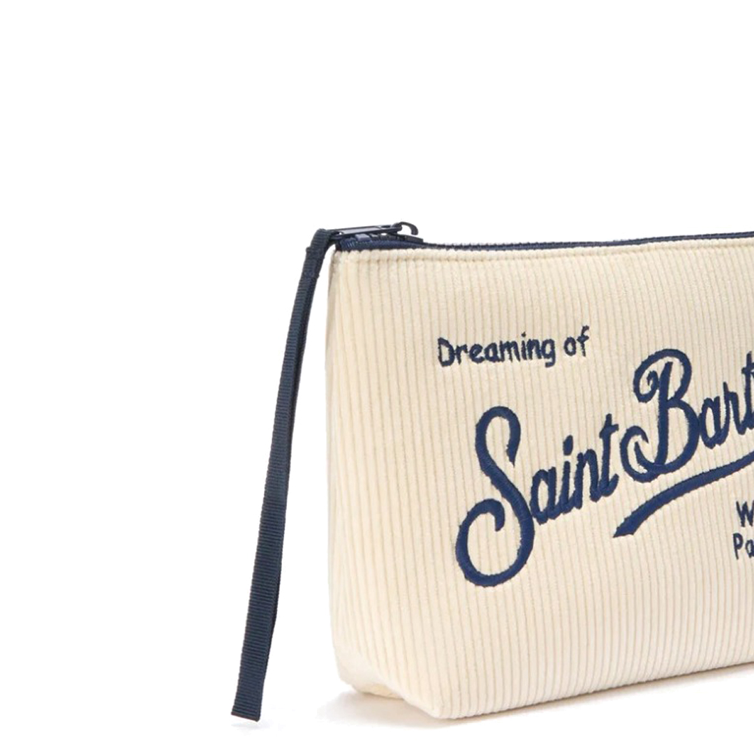 Retro-chic and contemporary: beige corduroy for a relaxed yet cool look. Scuba and corduroy clutch bag. Solid beige color. Grosgrain wrist loop. Embroidered logo. Dimensions: 21 x 15.5 x 7 cm.