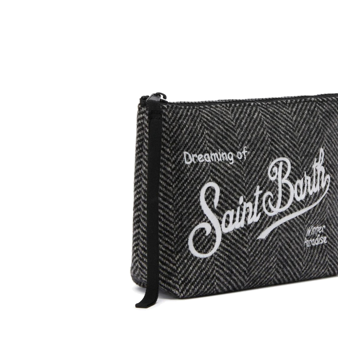 Elegance and character: the herringbone print for sophisticated looks. Clutch bag in scuba fabric and wool blend. Herringbone print. Grosgrain wrist loop. Embroidered logo. Dimensions: 21 x 15.5 x 7 cm.