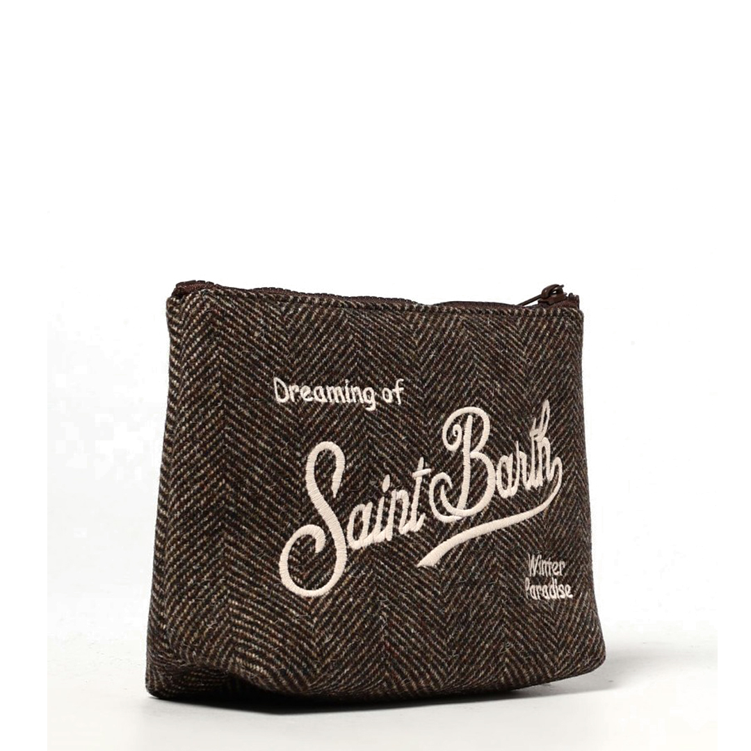 Elegance and character: the herringbone print for sophisticated looks. Clutch bag in scuba fabric and wool blend. Herringbone print. Grosgrain wrist loop. Embroidered logo. Dimensions: 21 x 15.5 x 7 cm.