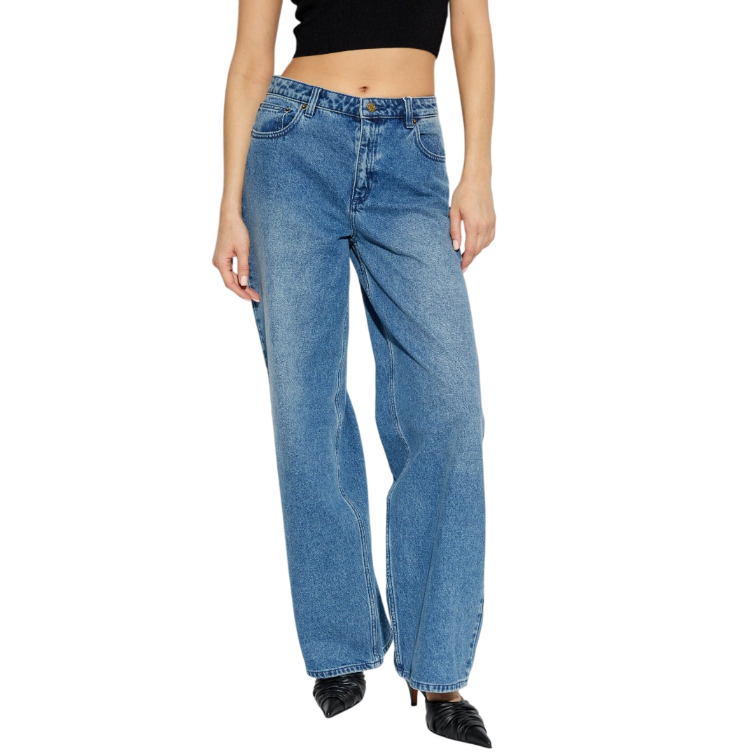 Relaxed fit jeans are in this season. This wide-leg style is made from stiff, heavy cotton in a blue wash and features five handy pockets. Wear with a cropped sweater and heels for a practical yet sophisticated look.