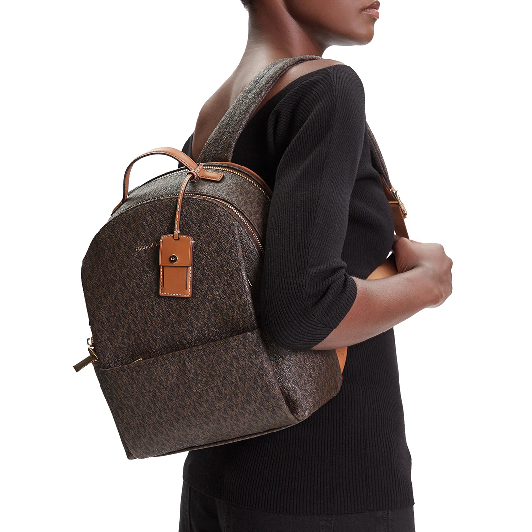 MICHAEL KORS backpack in faux leather with logo motif Two compartments with zip closure Short handle Adjustable shoulder straps External compartment with zip Side pockets Backpack dimensions: Small (does not contain A4 format) Dimensions: 25 x 33 x 11 cm