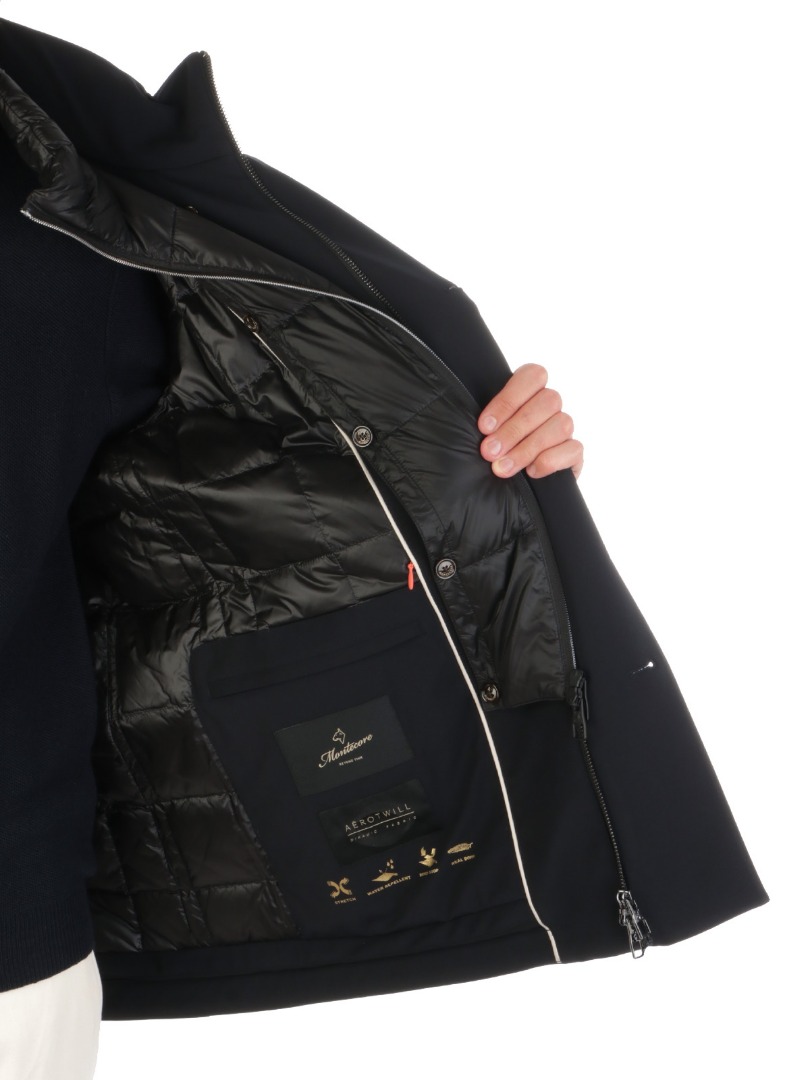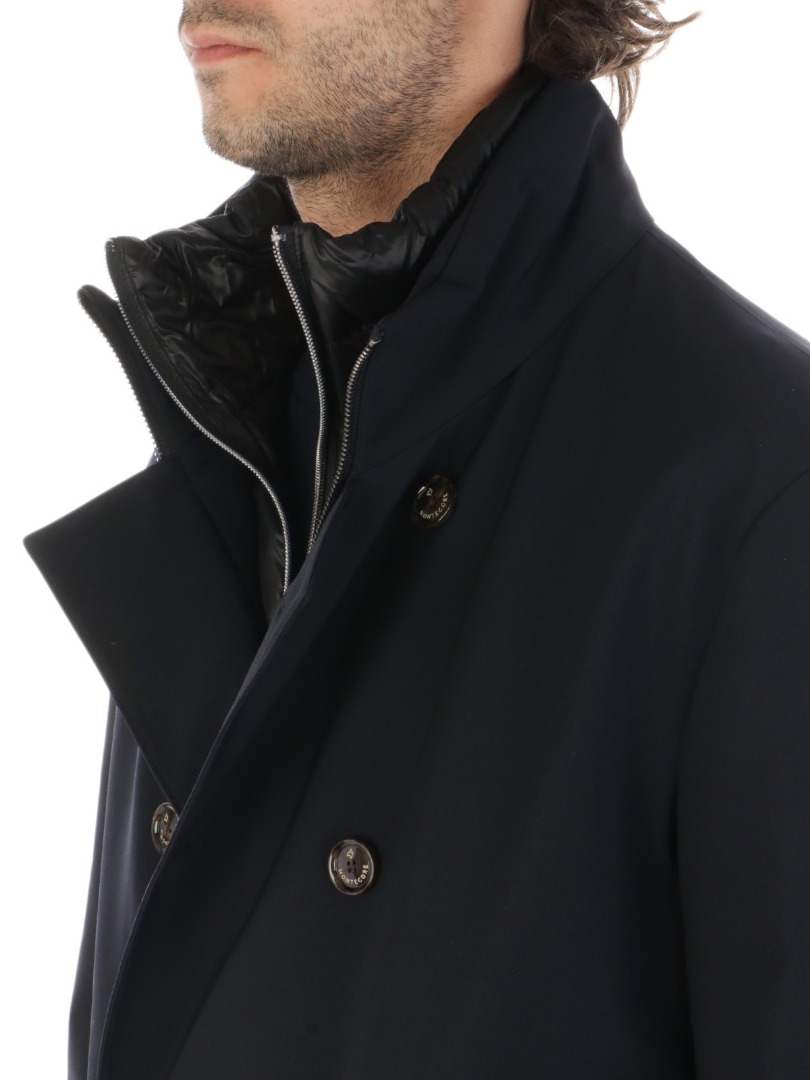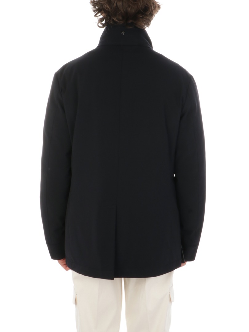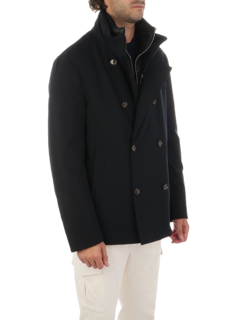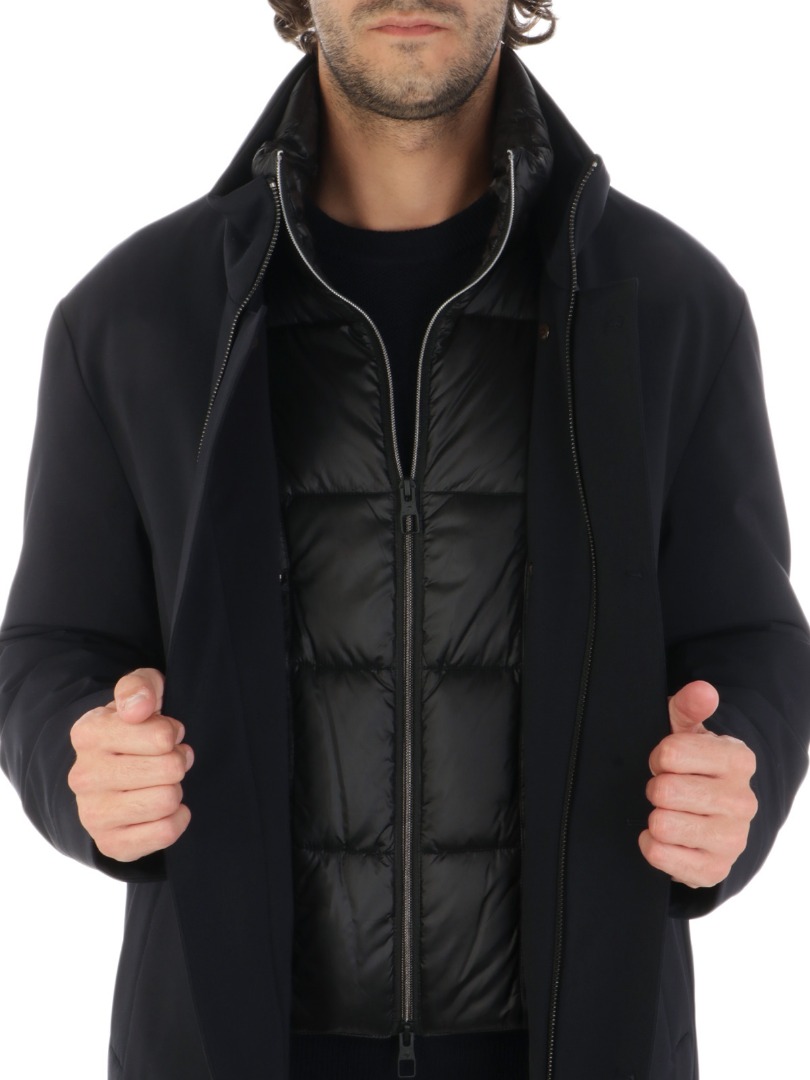 Men's jacket in stretch technical fabric Padded with down and feathers Double-breasted button fastening Removable quilted front with full-zip fastening Side welt pockets Stand-up collar Regular fit