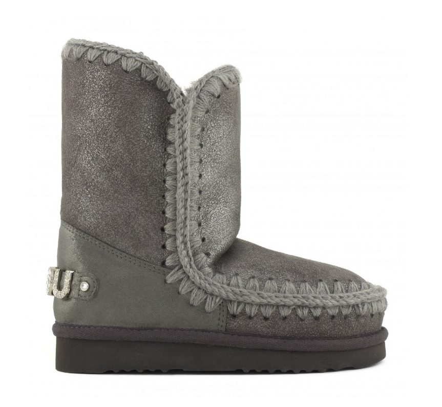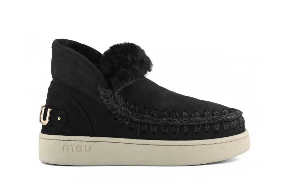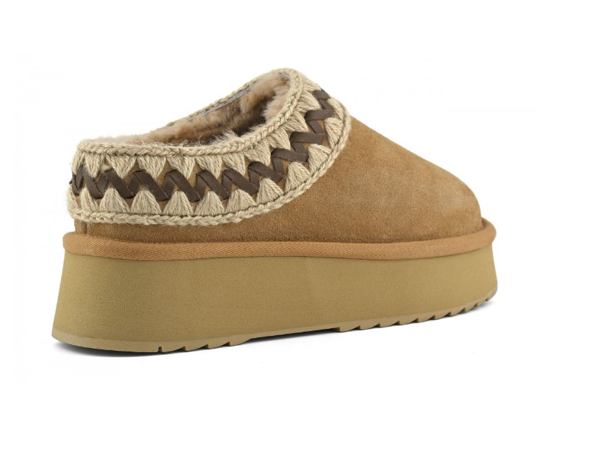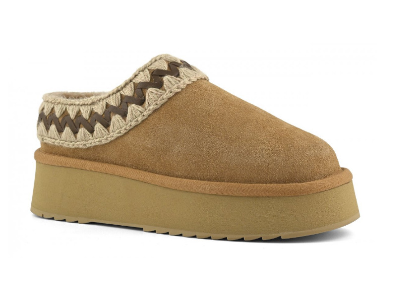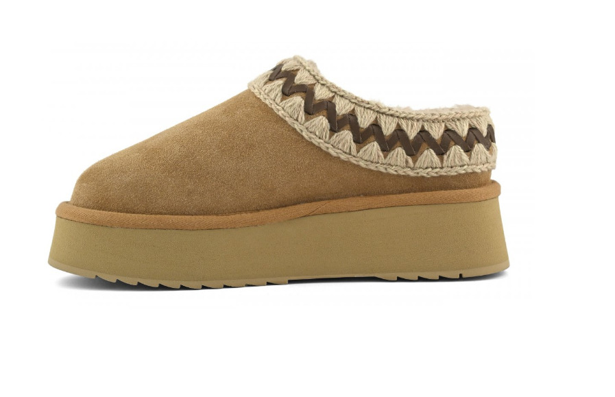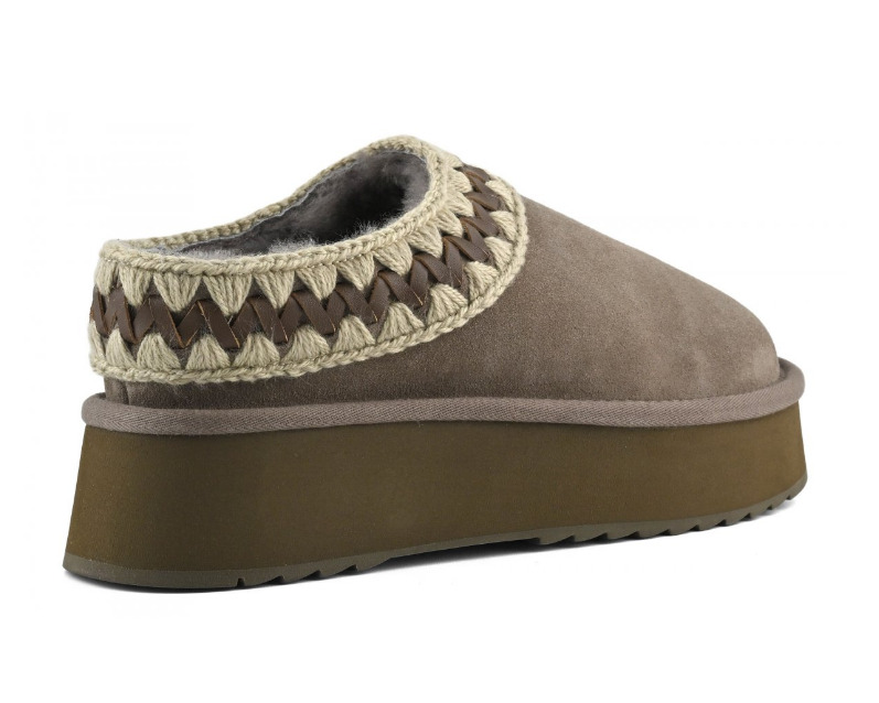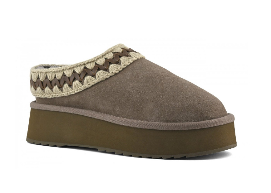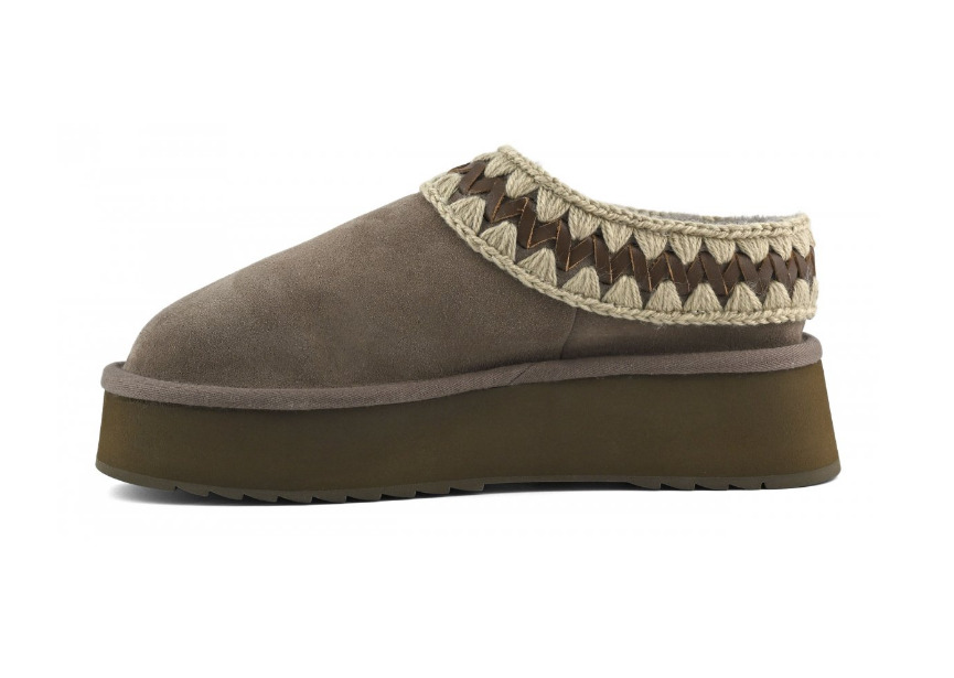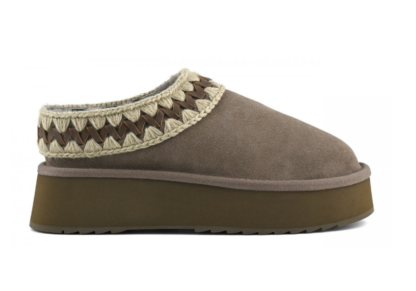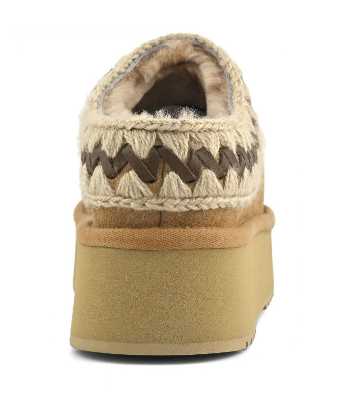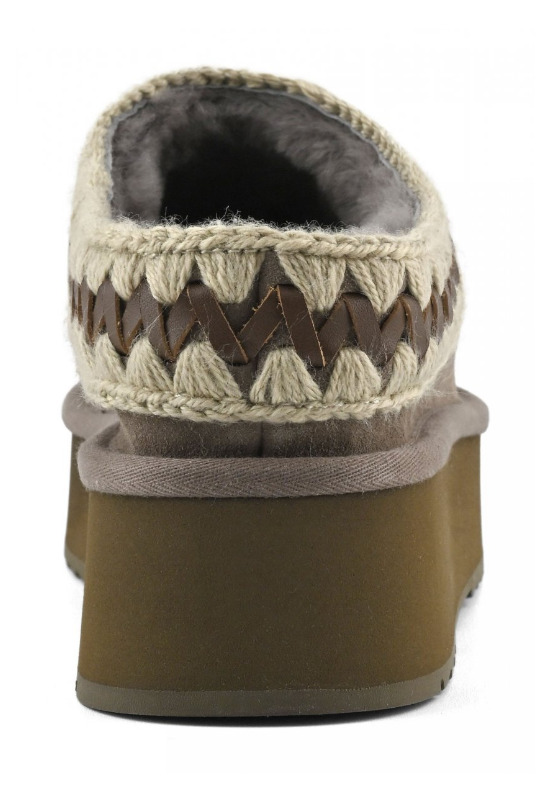 New for Fall/Winter 2025: the mou platform clog is a stunning new style expertly handcrafted from genuine double-faced sheepskin and embellished with mou's signature crochet wool details. Incredibly comfortable and durable, it features an EVA rubber sole. Height: 4 cm.