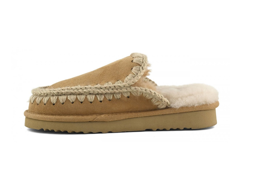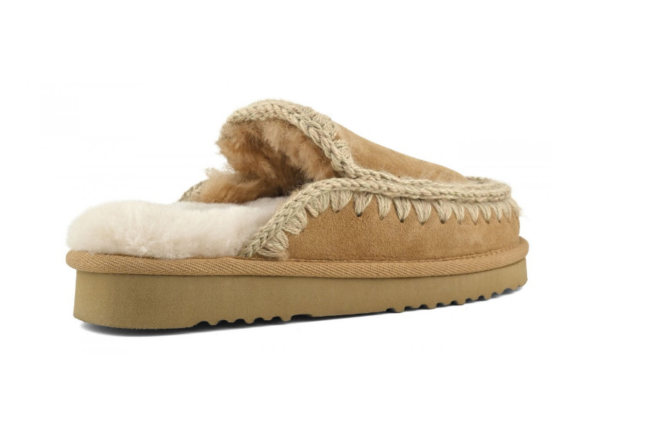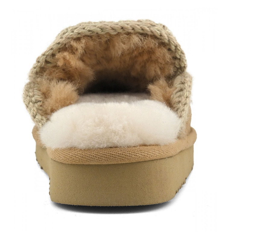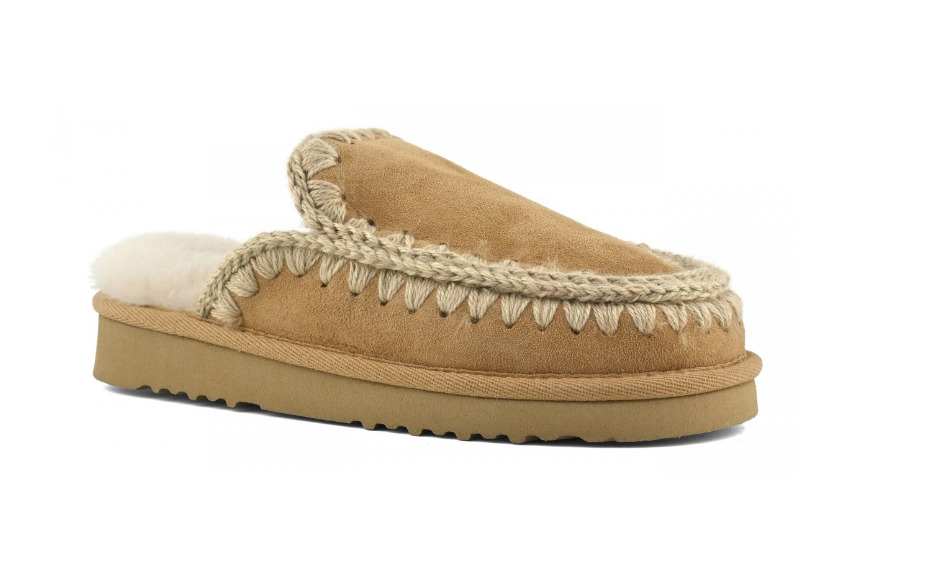 A winter must-have: the Mou Eskimo slipper with EVA sole, handmade from authentic double-faced sheepskin and embellished with Mou's signature crocheted wool stitching. Ideal for relaxing, this shoe offers extraordinary comfort thanks to its lightweight EVA and rubber sole.