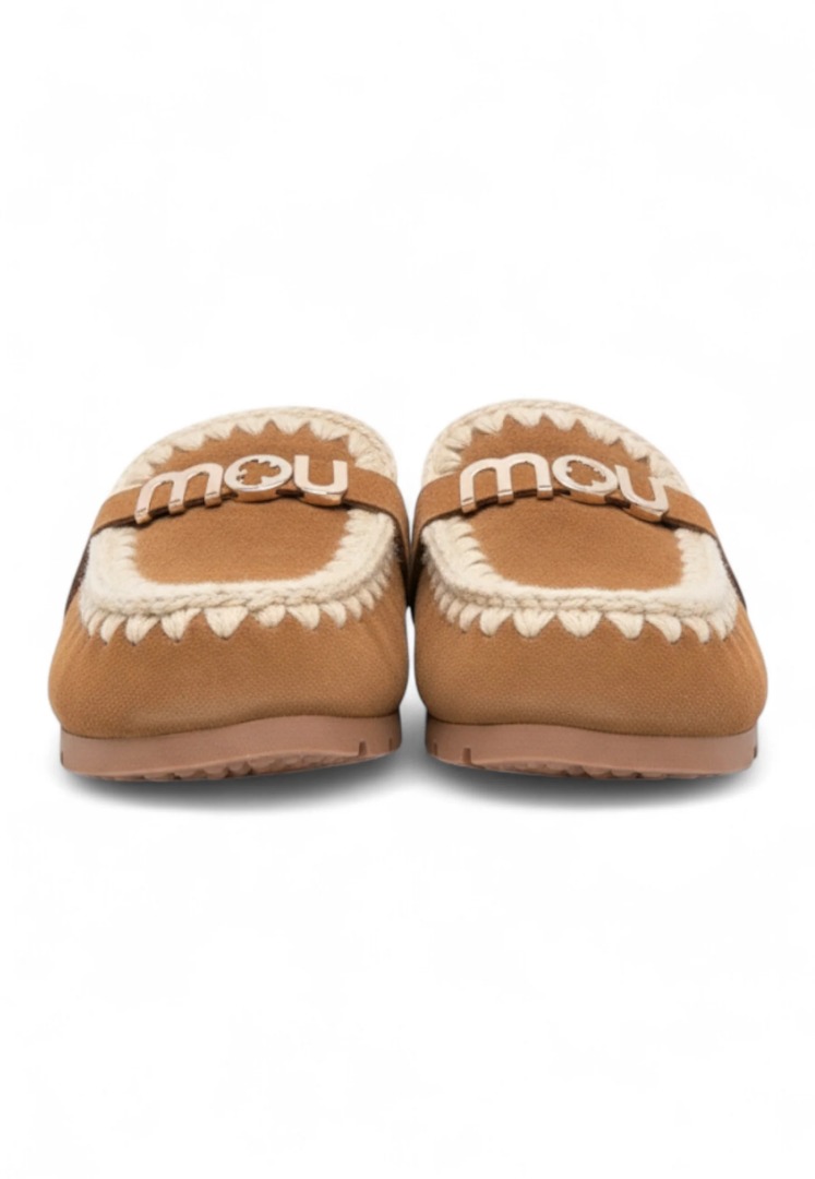 The Mou Winter Bio Slide is handcrafted from soft sheepskin and premium nubuck with a metal logo, embellished with Mou's signature crocheted wool stitching. This extremely comfortable model features a lightweight, practical sole for added durability.