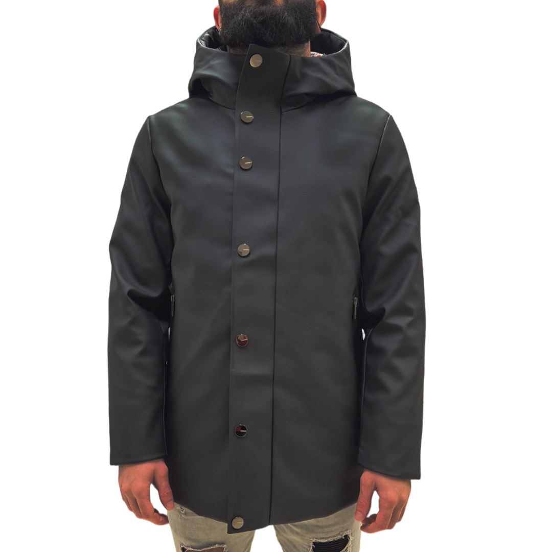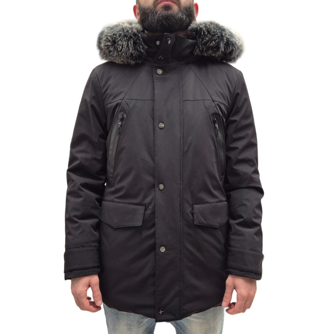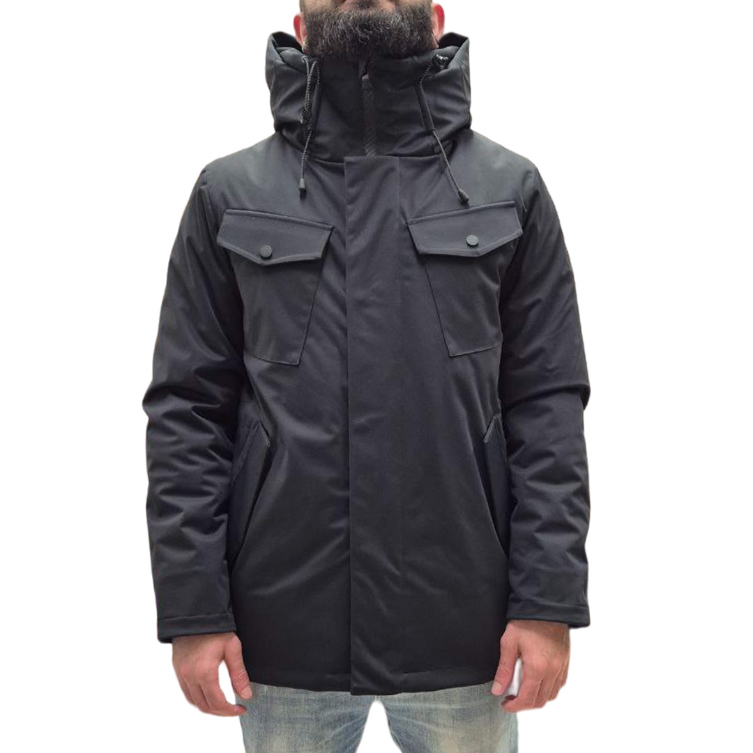 Jacket with hood in internal technical material in soft matt soft touch nylon, "PRIMALOFT" thermal insulation. Die-cast zip with personalized easy close double slider rubber. Rubberized logo on the left sleeve and rear collar in central position. Hidden external pockets with water-repellent/windproof zip closure with personalized rubber-effect slider. Main zip cover with hidden press stud closure. Internal cuffs in technical lycra for greater protection from external atmospheric agents and thermal performance. Internal main zip placket in technical material with chin protection and lasered "PEOPLE" writing. Internal lasered vents to facilitate donning and perspiration. Removable customized internal elastic braces. Internal zip-taped document/cell phone pockets. High visibility reflective details.