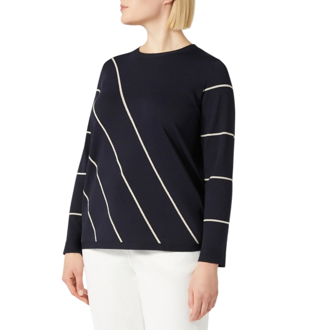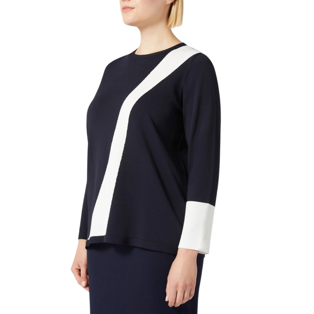 Refined inlay workmanship for the stretch viscose sweater, worked in two colors in satin. To give a graphic touch to the style. The garment is part of the Persona by Marina Rinaldi collection. Stretch viscose Straight line Crew neck Long sleeves