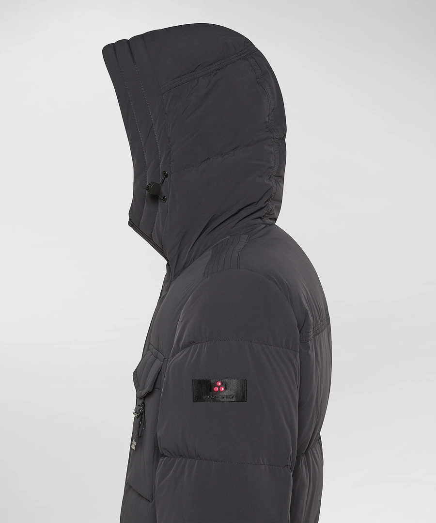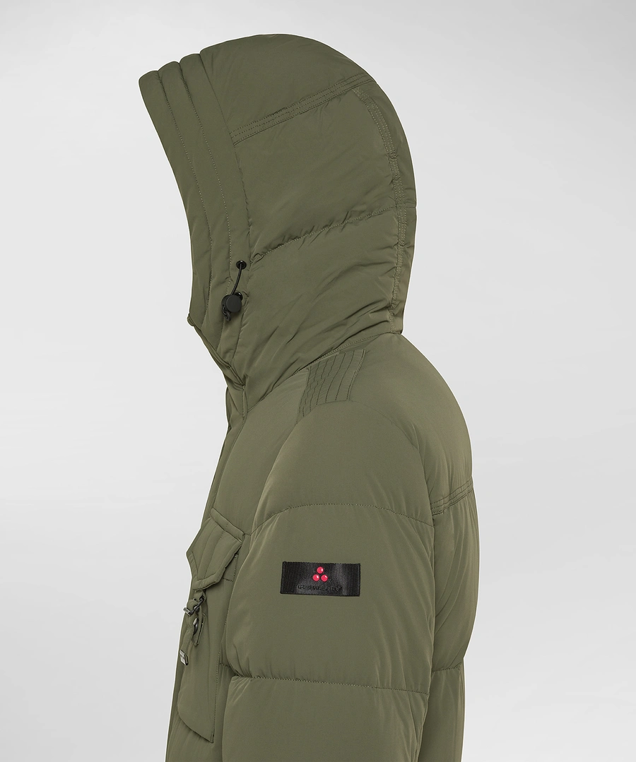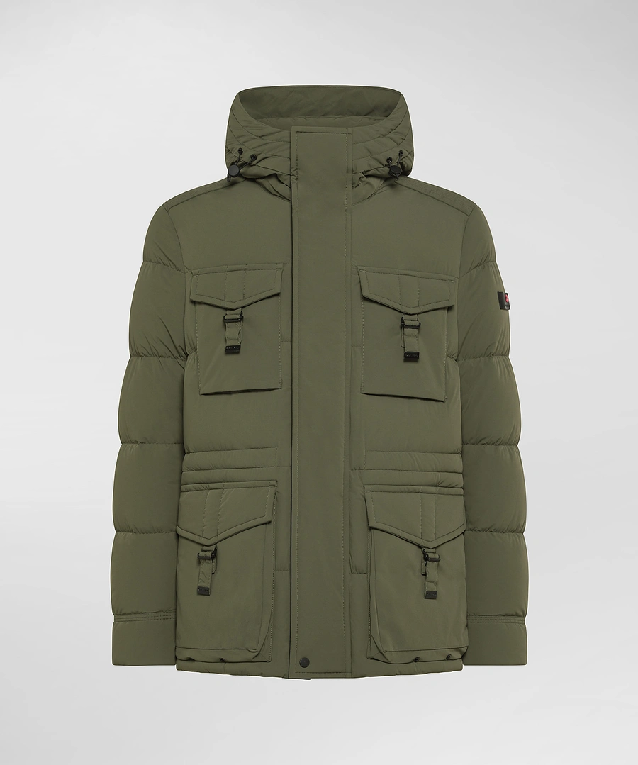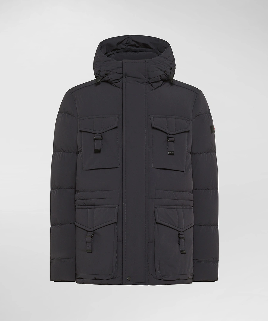 Stretch canvas field jacket made of matte, stretchy hollow-fiber nylon, which gives the garment comfort, lightness, and volume at the same time. The certified natural down padding ensures enveloping warmth and maximum comfort on the coldest days. The clean design is enhanced by an ergonomic hood and a central zipper covered by a flap, while the four front pockets with buckle closures and black windproof cuffs define a bold and functional look. New to the Linea line, the garments developed within this concept stand out for their high elasticity of the fabrics, which makes them extremely comfortable, minimalist in design, and highly adaptable to the body's shape, ideal for an essential style that does not sacrifice functionality. The PFC-free water-repellent treatment ensures protection from the elements without the use of environmentally harmful substances. A garment that stands out for its urban and contemporary style, perfect for those who want to feel protected without sacrificing a touch of elegance. Full central zip covered by flap Length: medium In stretch nylon canvas Fixed hood Down proof Certified natural down padding Four front pockets with buckle PFC free water repellent treatment