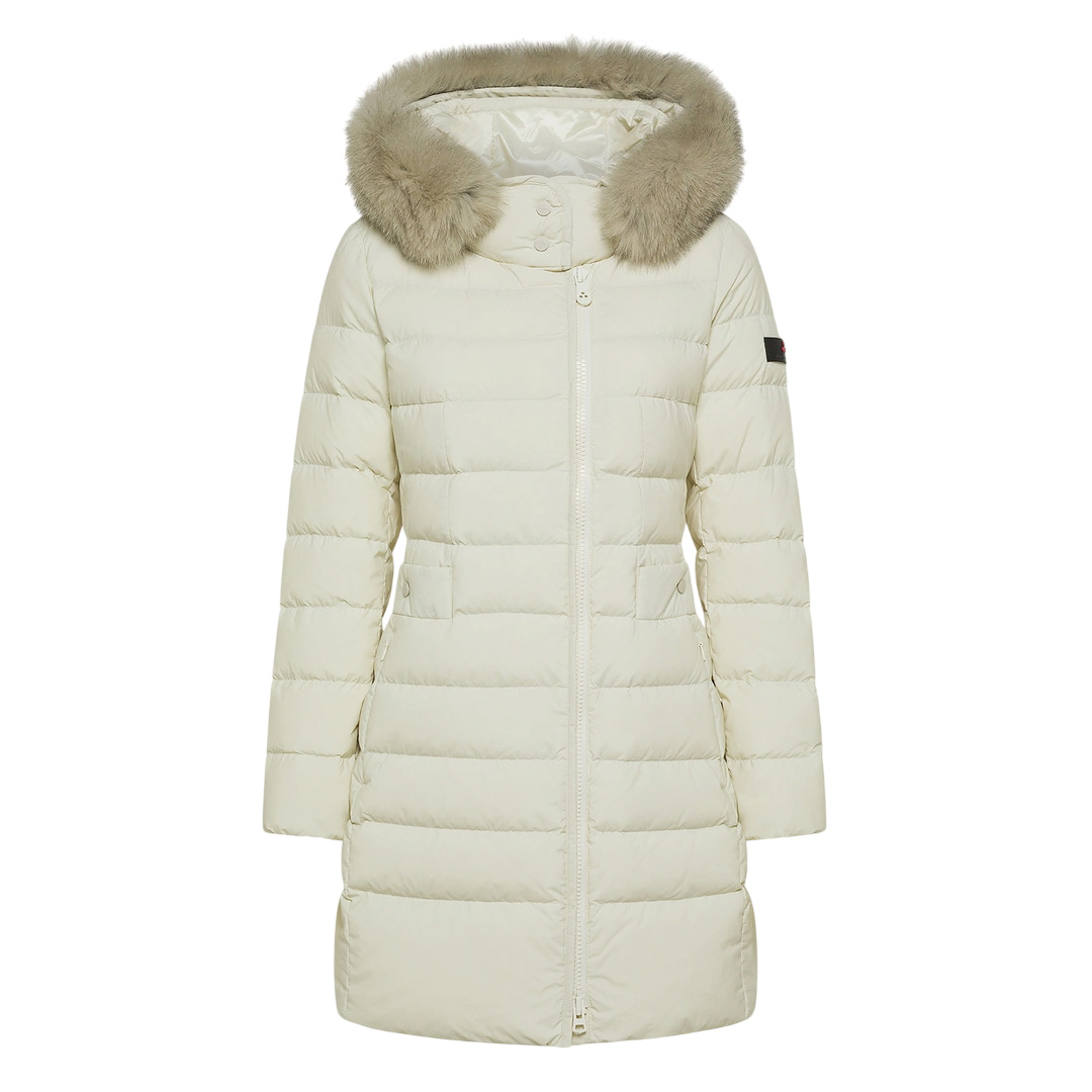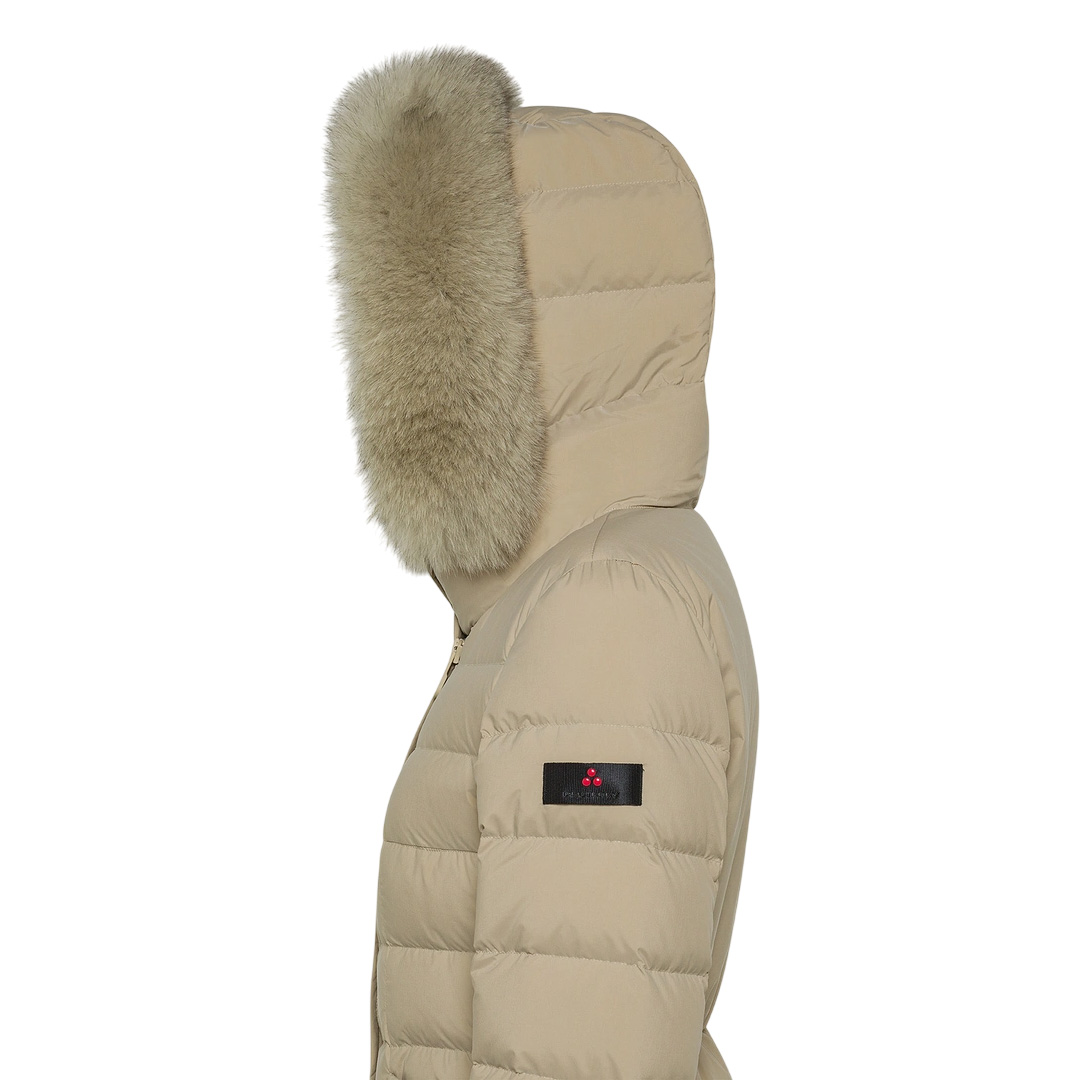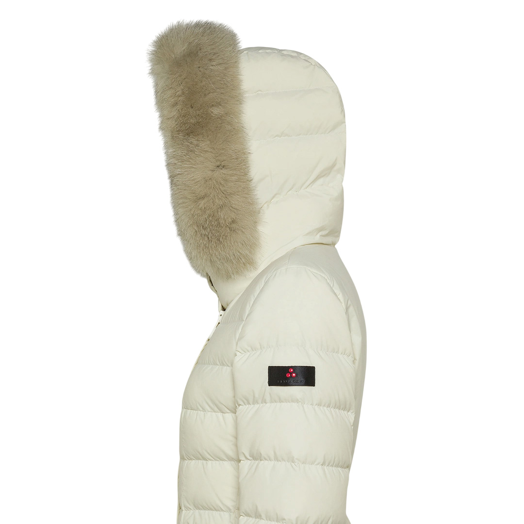 Long quilted down jacket in lightweight nylon poplin and polyester microfiber, treated at high temperatures for a firm, powdery feel, and then rendered extremely soft with a silicone finish. The certified natural down padding provides lightweight thermal protection, while the water-repellent treatment maintains comfort even in light rain. The design features a central two-way zip, a wrap-around collar with tone-on-tone snaps, and a removable hood trimmed with fox fur. The snap-button side pockets complete this refined and functional piece, perfect for winter in the city. An iconic model from the brand, reinterpreted with modern and even more refined details. Snap-button collar Nylon poplin and polyester microfiber Hood trimmed with fox fur Water-repellent Natural down padding Length: long Fit: slim