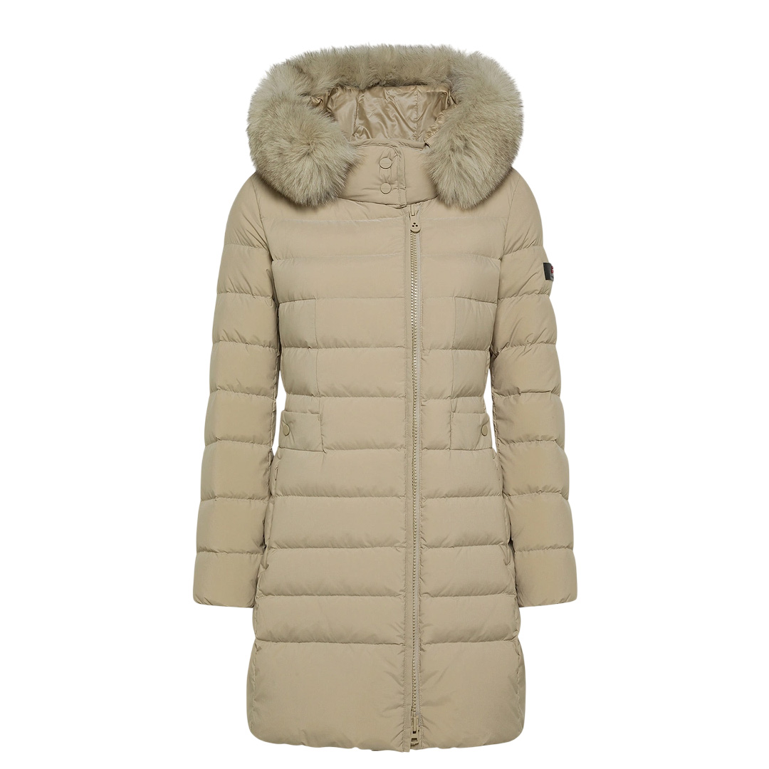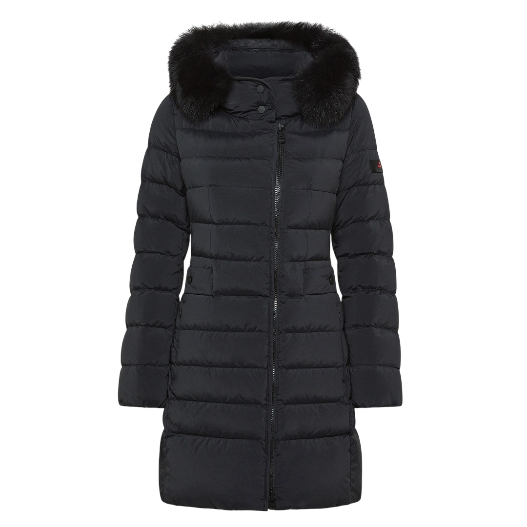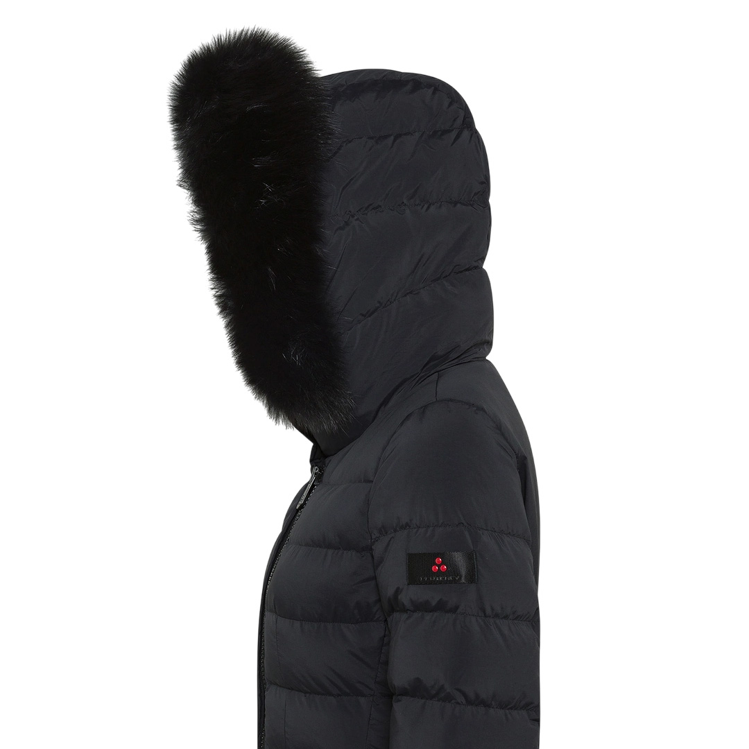 Long quilted down jacket in lightweight nylon poplin and polyester microfiber, treated at high temperatures for a firm, powdery feel, and then rendered extremely soft with a silicone finish. The certified natural down padding provides lightweight thermal protection, while the water-repellent treatment maintains comfort even in light rain. The design features a central two-way zip, a wrap-around collar with tone-on-tone snaps, and a removable hood trimmed with fox fur. The snap-button side pockets complete this refined and functional piece, perfect for winter in the city. An iconic model from the brand, reinterpreted with modern and even more refined details. Snap-button collar Nylon poplin and polyester microfiber Hood trimmed with fox fur Water-repellent Natural down padding Length: long Fit: slim