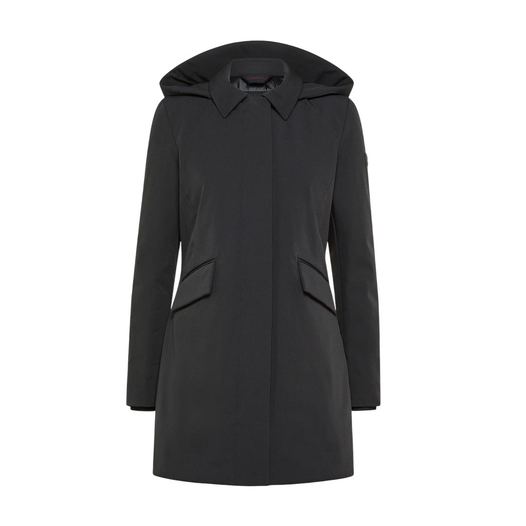 Smooth, feminine, and elegant jacket made of two-way stretch nylon canvas bonded to a soft jersey lining, combining elegance and thermal comfort. The fitted fit flatters the figure, while the synthetic padding offers lightweight, everyday protection. A shirt collar, flap pockets, and a full, two-way central zip define a simple yet bold design. Contrasting black windproof cuffs add a graphic, contemporary touch. The ideal piece to enhance your city outfits. Shirt collar Two-way stretch nylon and jersey Slim fit Black windproof cuffs Two-way stretch nylon and jersey Synthetic padding Slim fit