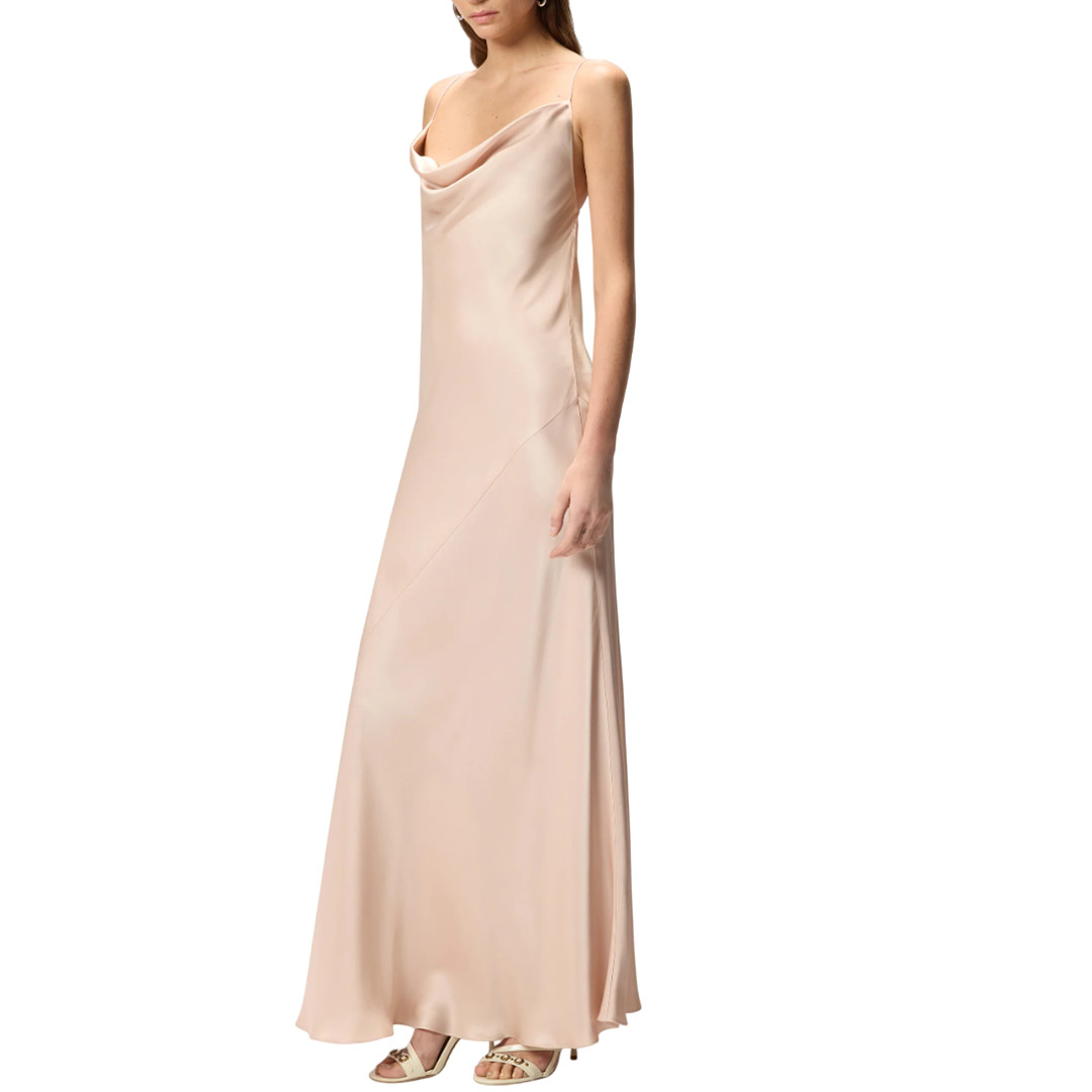 A long slip dress with thin shoulder straps, a soft draped front neckline, and a wide scoop neckline that leaves the back exposed, separated only by two ribbons that tie at the center. This PINKO design is crafted from soft, lustrous double-faced satin, a fabric with a uniform appearance both inside and out, which delicately hugs the body and allows for a fluid, lightweight fit. This elegant and feminine dress is perfect for formal occasions and cocktail parties.