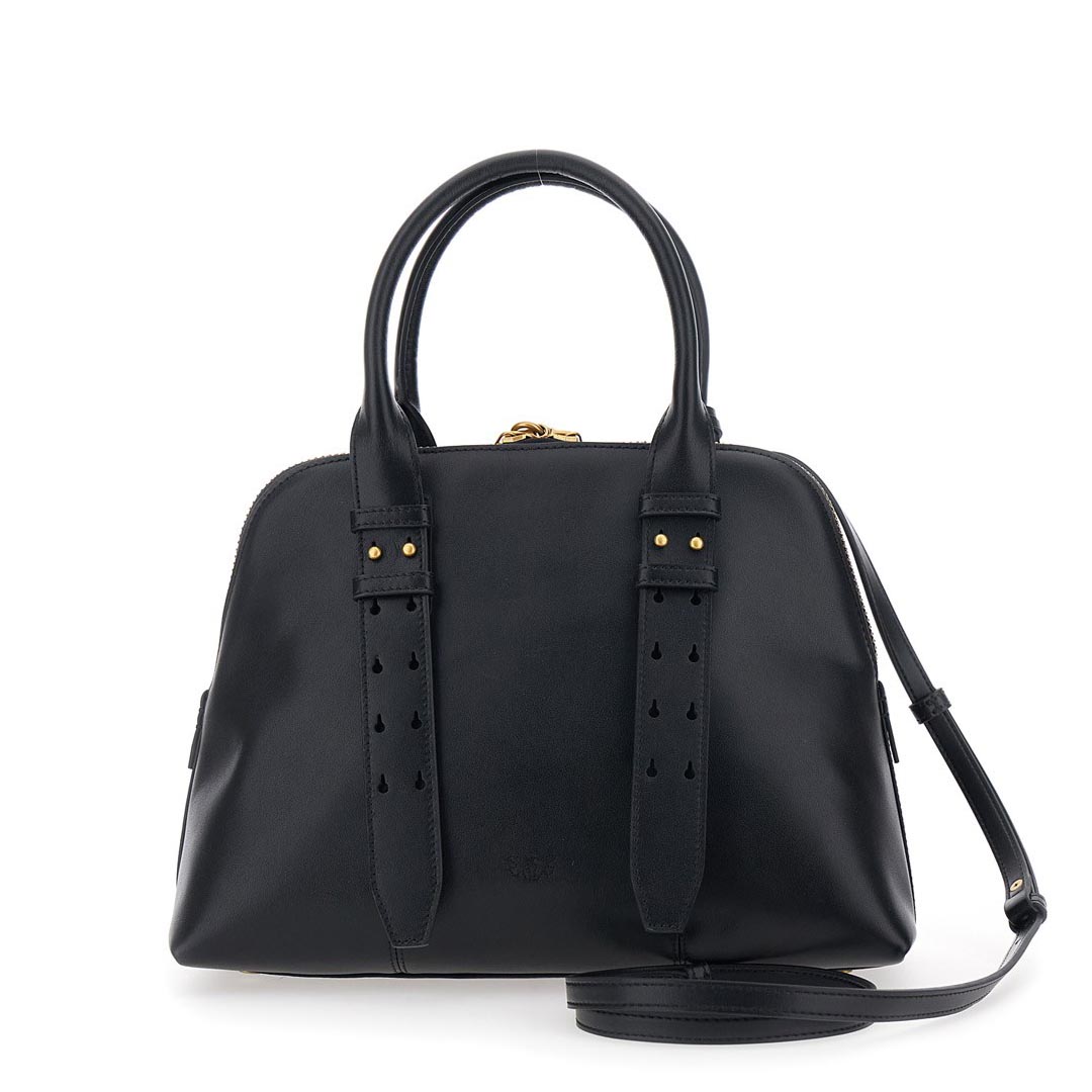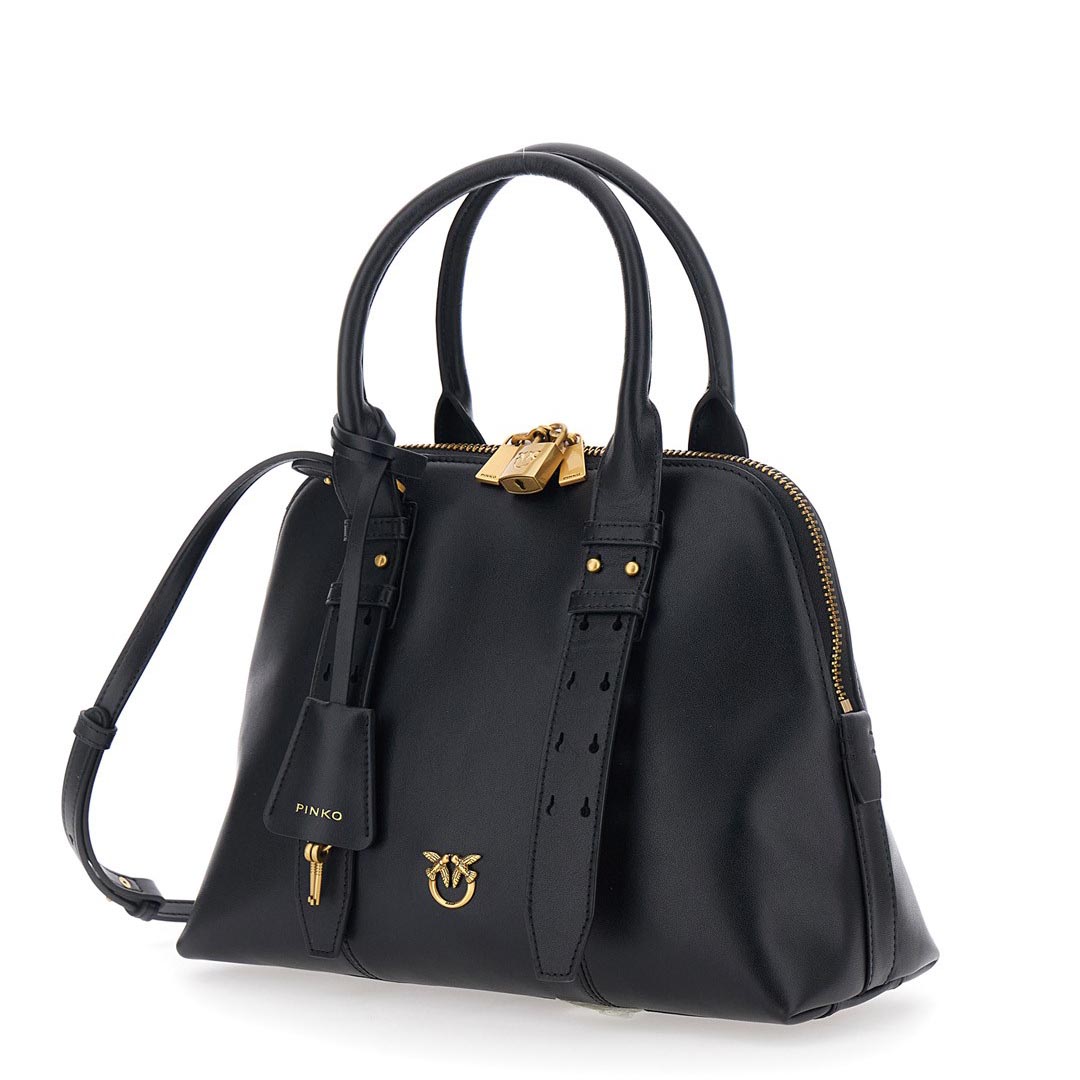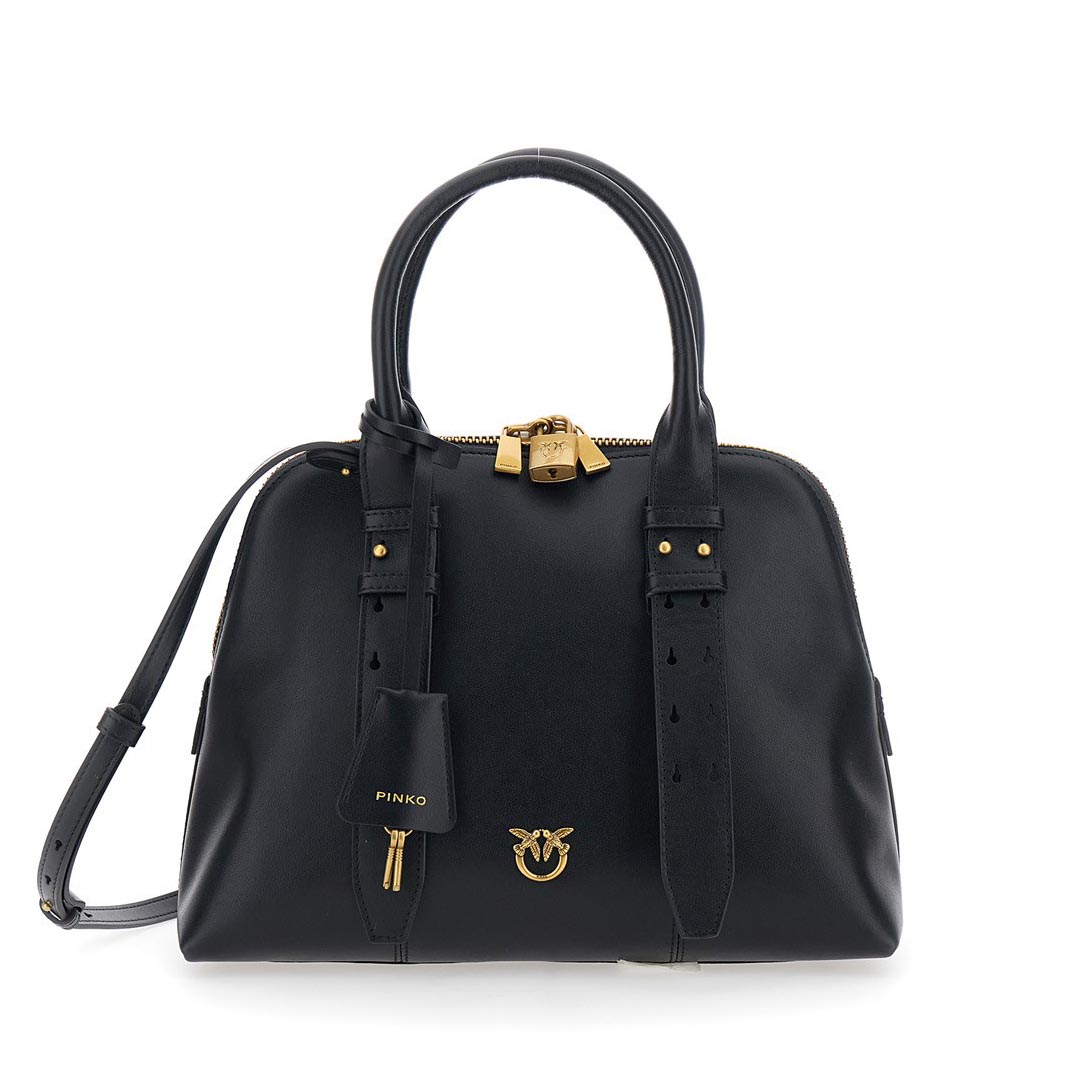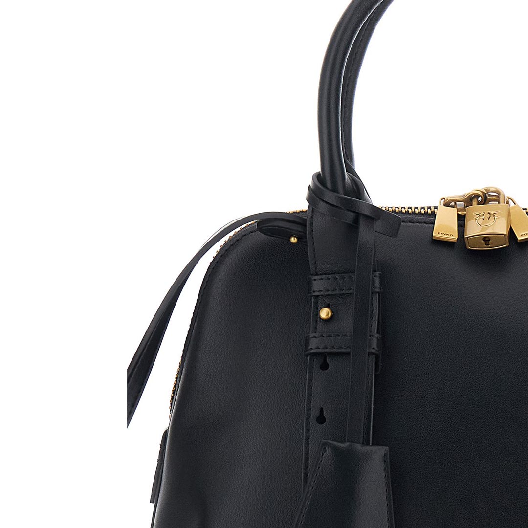 The Escape Bag medium bowling bag is crafted entirely from soft leather. Featuring an adjustable and removable leather shoulder strap and a double handle for carrying by hand or over the shoulder, this bag is extremely versatile and practical. It features a functional padlock that opens and closes with a key contained in the matching charm, while the small Love Birds logo plaque adds the finishing touch, embodying the brand's inimitable style. The top zip closure reveals a cotton-lined interior with a zipped wall pocket. Activate your PINKO bag: verify the authenticity of your product and access the personalized experience by holding your smartphone close to the Love Birds embroidery on the back of the bag! Height: 23 cm Width: 13 cm Length: 30 cm