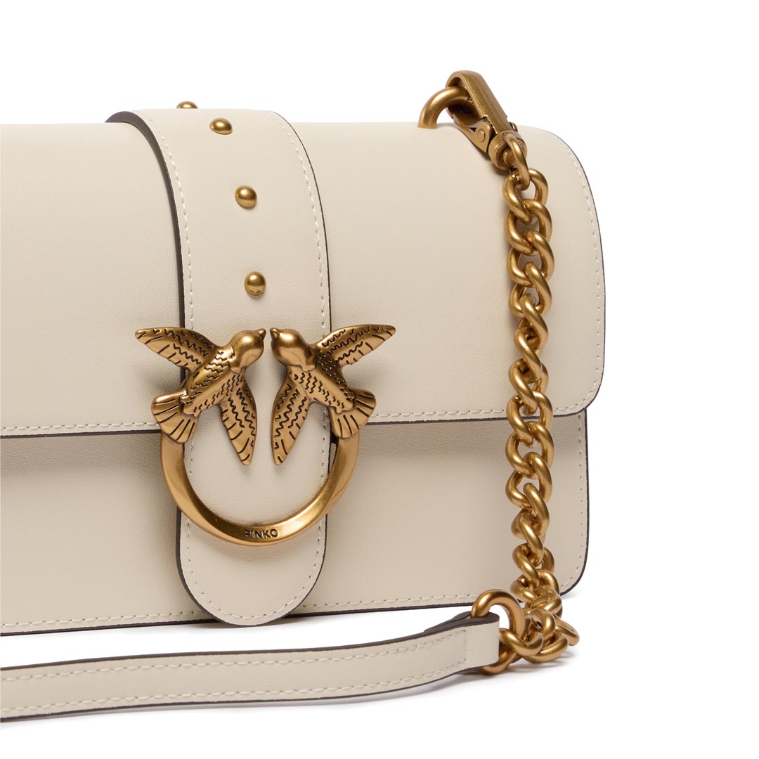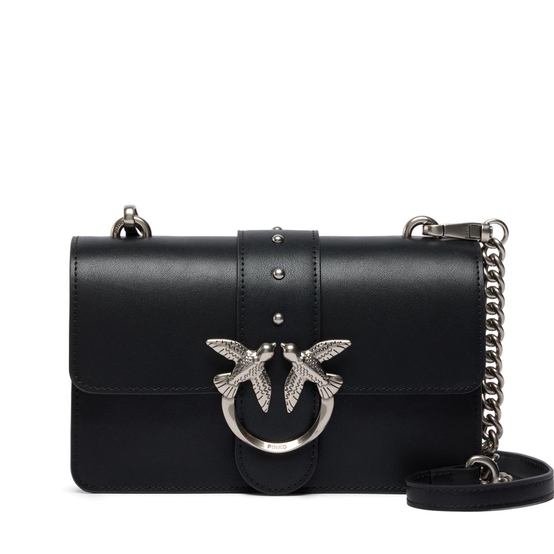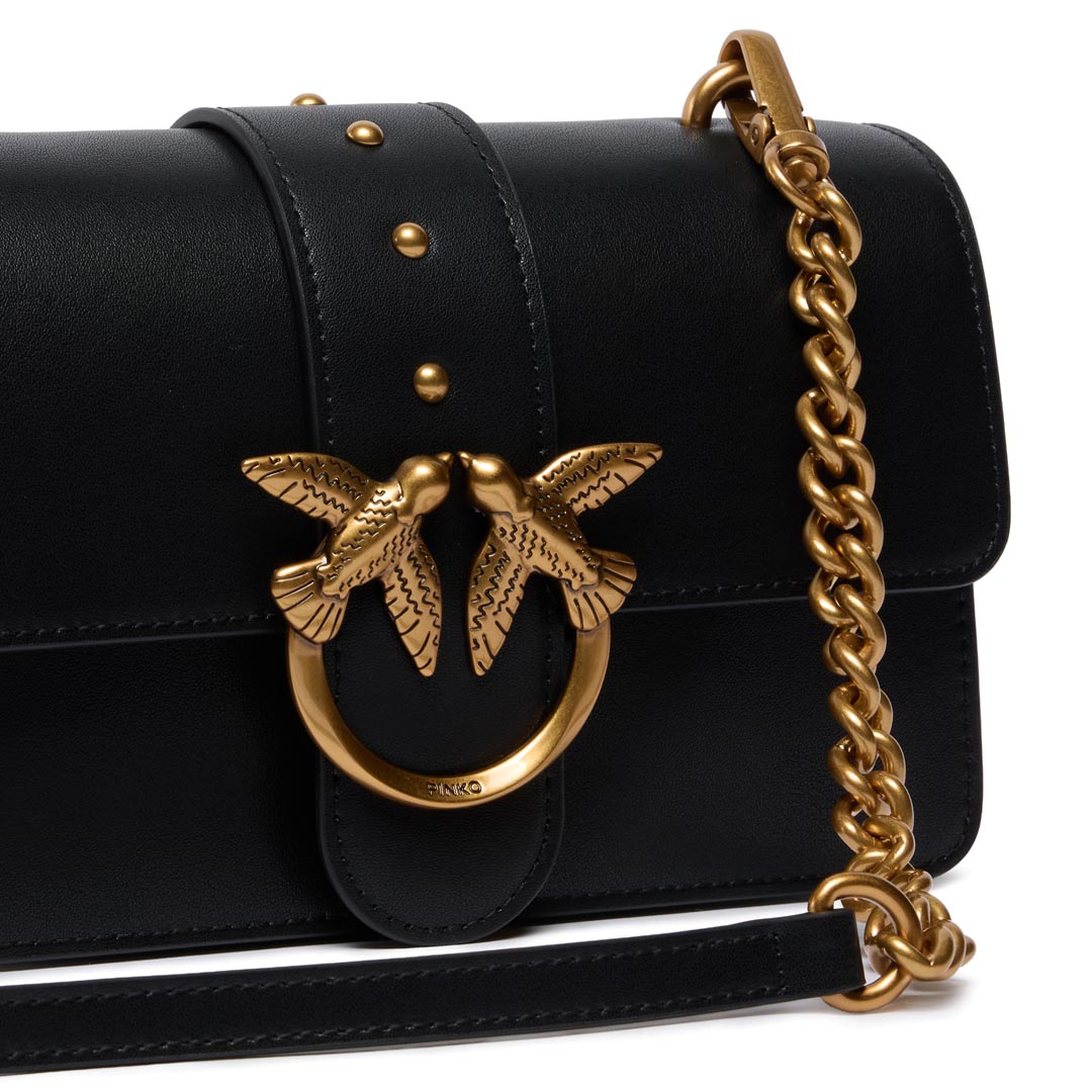 Love Bag One small shoulder bag made of silky leather. Featuring an adjustable and removable leather and chain shoulder strap, this model is extremely versatile and practical. The magnetic snap closure is finished with a buckle featuring the Love Birds Diamond Cut logo and small antique gold-plated metal studs. The interior is lined in cotton and features a zip pocket to keep your essentials safe. Activate your PINKO bag: verify the authenticity of your product and access the personalized experience by holding your smartphone close to the Love Birds embroidery on the back of the bag! Height: 13 cm Width: 7 cm Length: 21 cm
