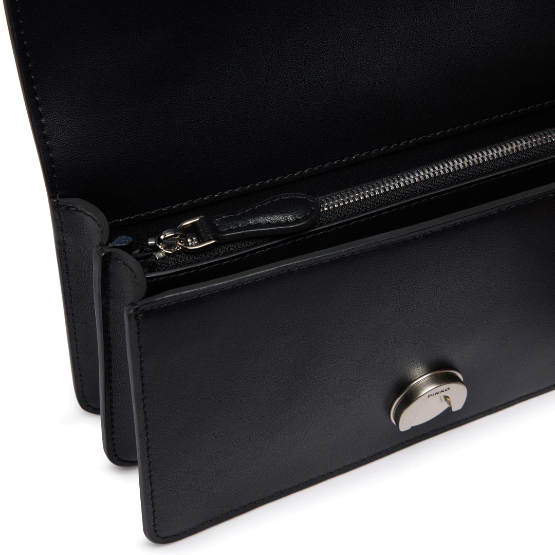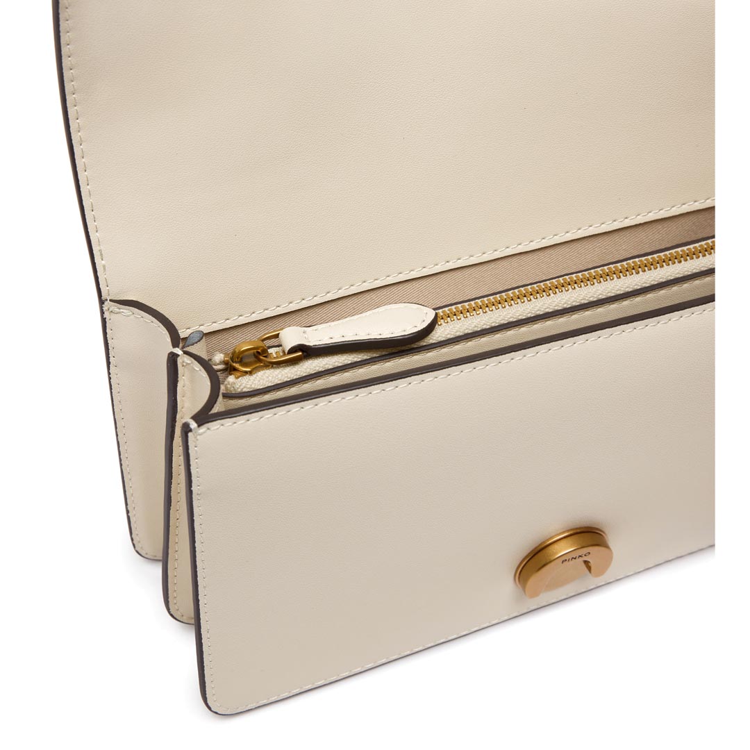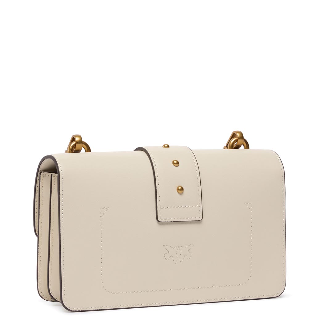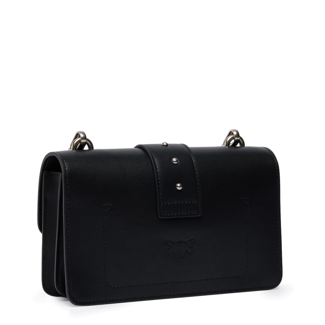 Love Bag One small shoulder bag made of silky leather. Featuring an adjustable and removable leather and chain shoulder strap, this model is extremely versatile and practical. The magnetic snap closure is finished with a buckle featuring the Love Birds Diamond Cut logo and small antique gold-plated metal studs. The interior is lined in cotton and features a zip pocket to keep your essentials safe. Activate your PINKO bag: verify the authenticity of your product and access the personalized experience by holding your smartphone close to the Love Birds embroidery on the back of the bag! Height: 13 cm Width: 7 cm Length: 21 cm