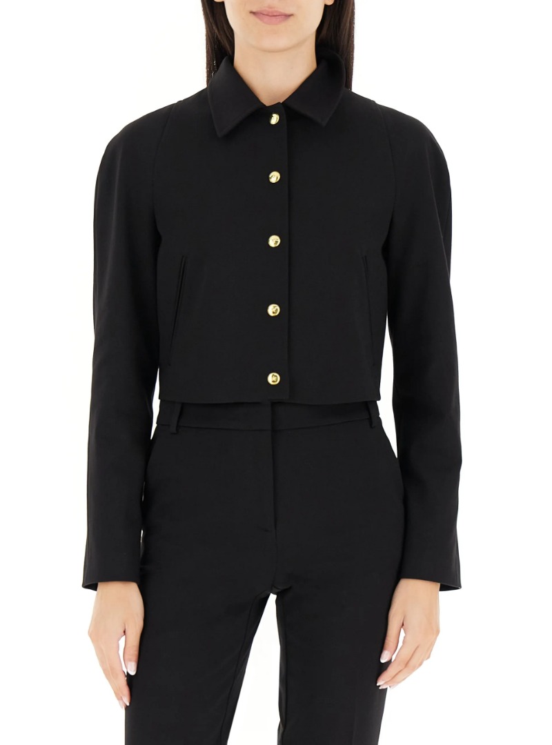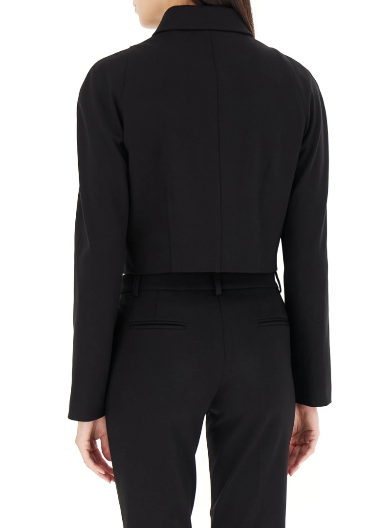 Cropped jacket with a straight hem and classic shirt collar, crafted from technical viscose fabric with a textured knit. The slim-fit model features long sleeves and no pockets for a minimalist style that doesn't sacrifice feminine details. This piece is the perfect solution when you're looking for a refined, effortless look with an added touch of elegance.