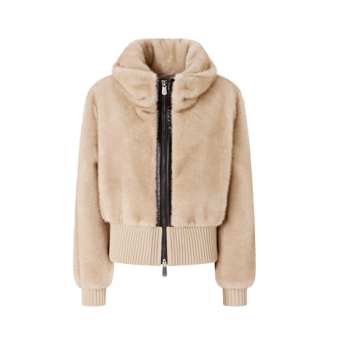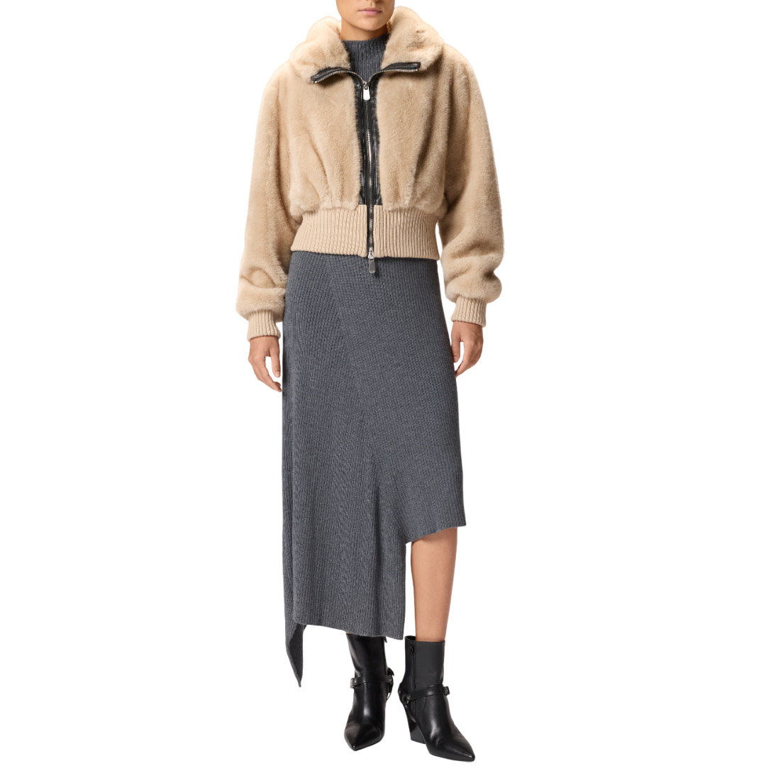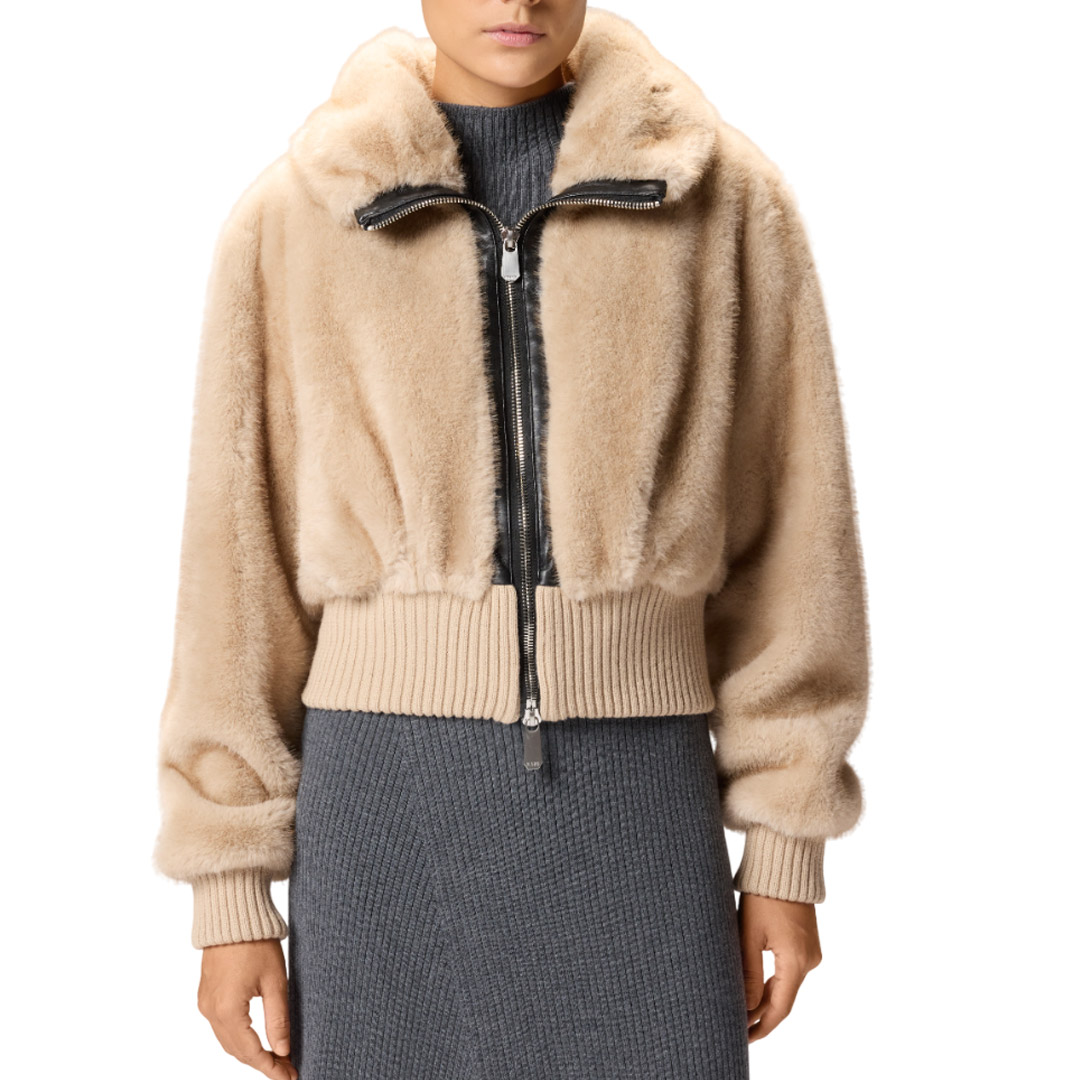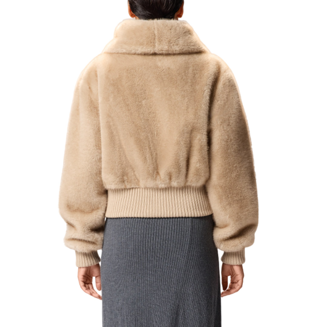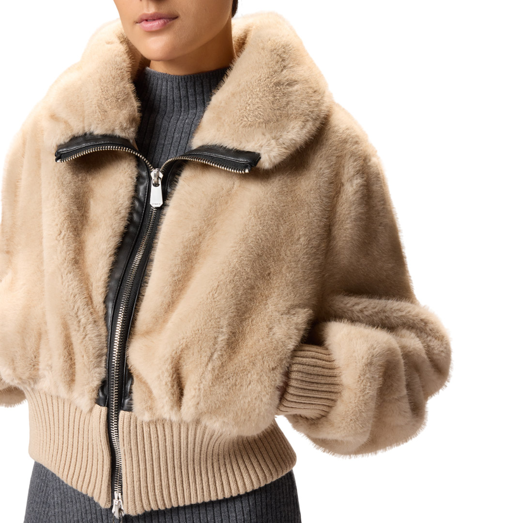 A short bomber jacket featuring a cozy stand-up collar and comfortable ribbed knit hem and cuffs. The piece is crafted from soft, fur-effect Aspen fabric, which is particularly pleasant to the touch. The attention to detail typical of PINKO creations is also evident in the soft nappa leather trims that outline the front two-way zip closure. Lined. Brave the coldest temperatures with this piece, ready to give you a soft embrace.