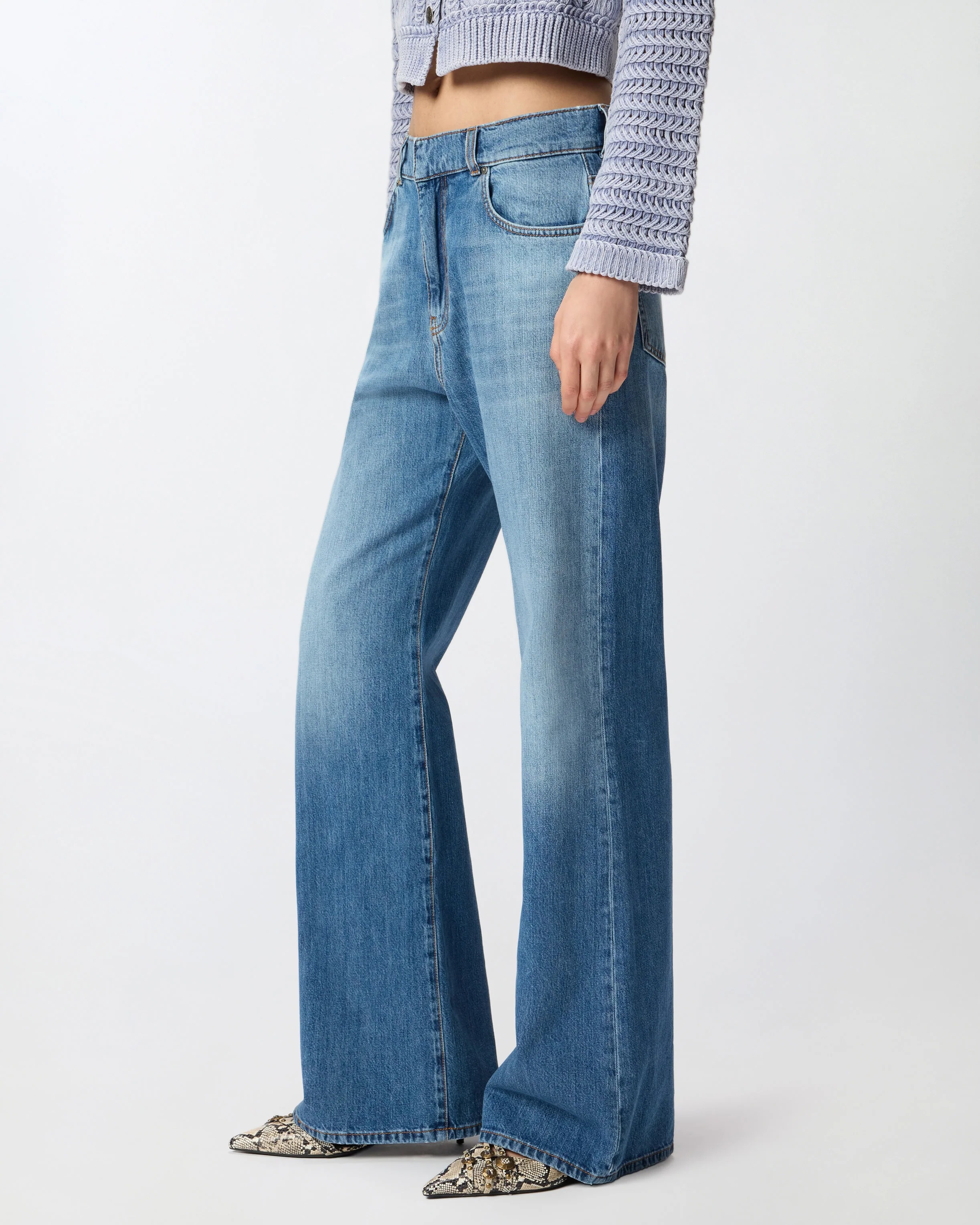 Wide-leg five-pocket jeans in soft-touch pure cotton denim, featuring a medium wash with noticeable fading for an attractive vintage effect. Personalizing the design in pure PINKO style are the brand's embroidered lettering logo on the back waistband and the Love Birds logo with embroidered birds on the right back pocket. Contemporary and versatile, these jeans will become the absolute protagonists of your everyday outfits. - WANDA WIDE LEG
