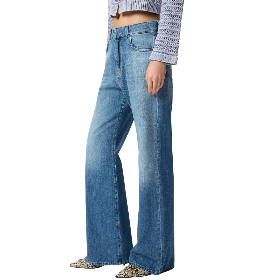 Wide-leg five-pocket jeans in soft-touch pure cotton denim, featuring a medium wash with noticeable fading for an attractive vintage effect. Personalizing the design in pure PINKO style are the brand's embroidered lettering logo on the back waistband and the Love Birds logo with embroidered birds on the right back pocket. Contemporary and versatile, these jeans will become the absolute protagonists of your everyday outfits. - WANDA WIDE LEG