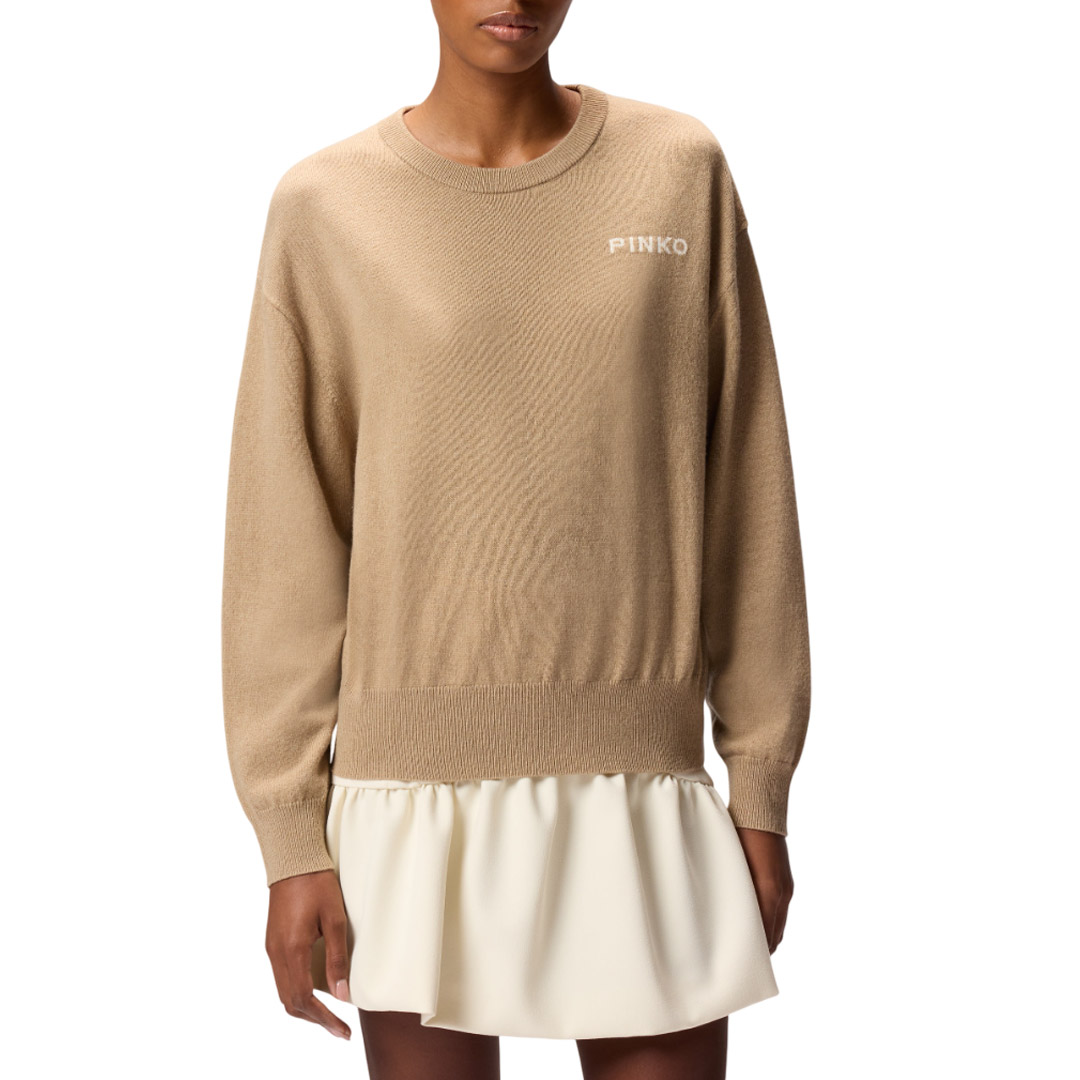 Long-sleeved crewneck sweater in a premium wool and cashmere blend. This piece perfectly expresses the brand's inimitable style, enhanced by the large Love Birds logo on the back and the contrasting PINKO lettering logo on the left chest. The garment has undergone finishing tests to minimize pilling, ensuring greater softness and durability of the fabric. The design is completed by a ribbed crewneck, hem, and cuffs.