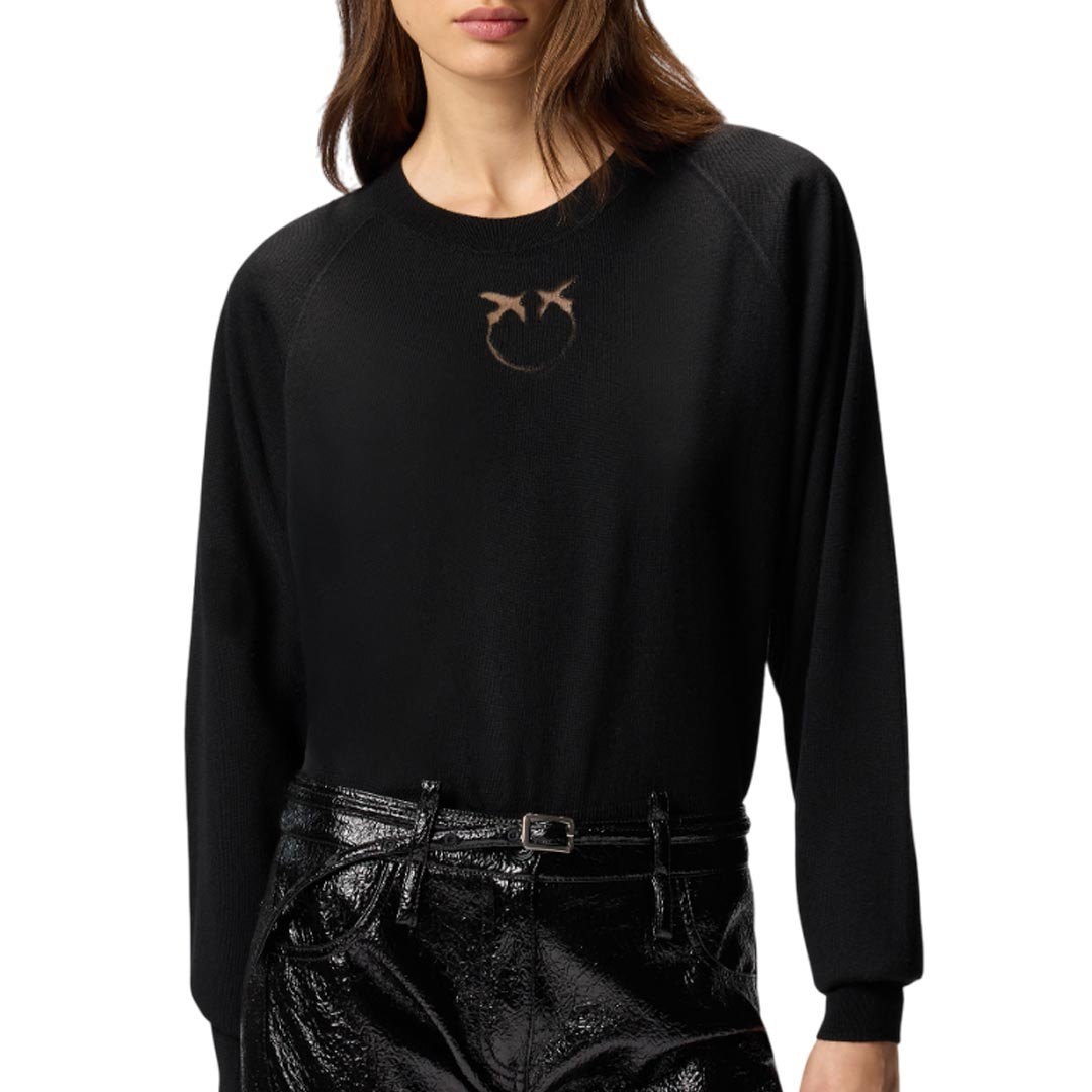Long-sleeved, fitted sweater with a polo-style collar. The collar immediately catches the eye thanks to the rhinestone appliqués that embellish the design. The hem and cuffs are ribbed, while the tone-on-tone label with PINKO lettering logo stands out at the bottom of the front. The garment has undergone finishing tests to minimize pilling, ensuring greater softness and durability of the fabric.