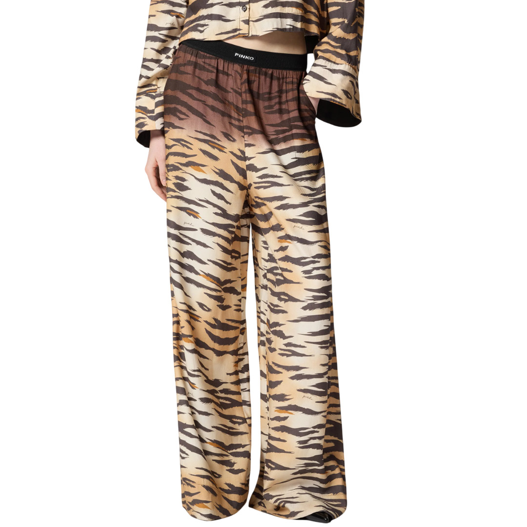 Pants made of twill fabric with a flowing, shiny feel, particularly suitable for summer. The style stands out for its seductive tiger animal print with a darker, faded upper section, which is hand-placed on each piece to transform it into a unique and inimitable creation. The pants are finished with a PINKO lettering logo label on the back.