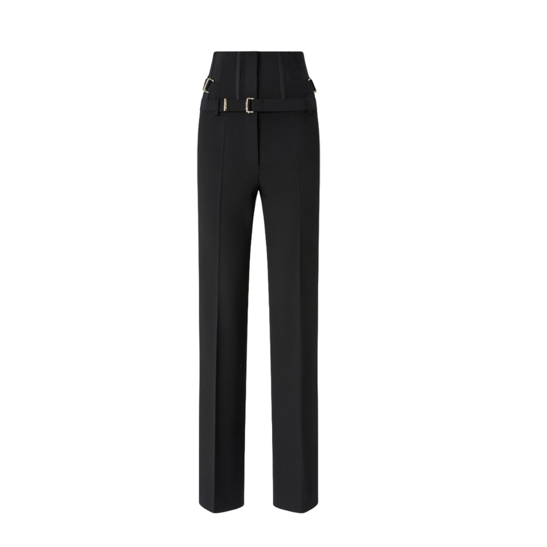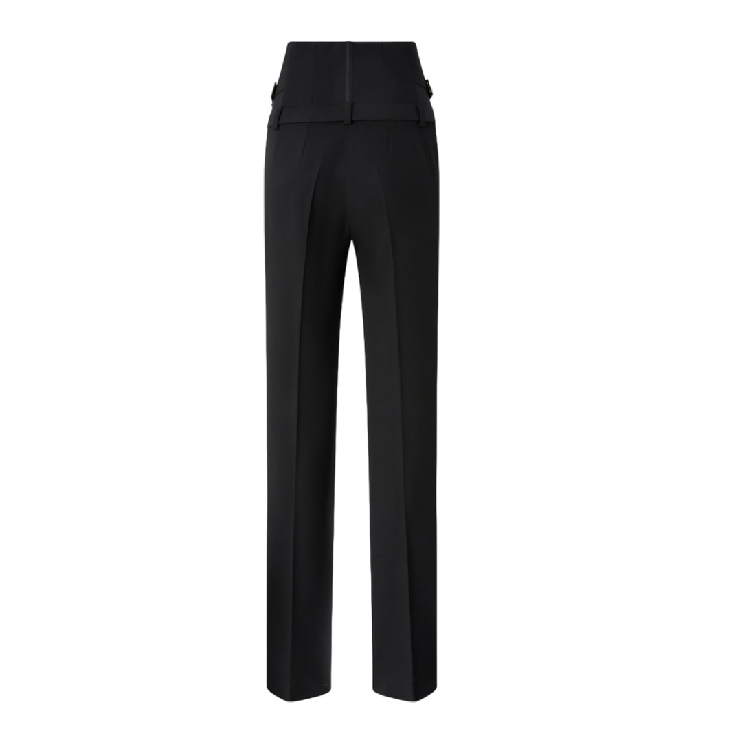 Straight-leg trousers featuring a very high-waisted design with boning reminiscent of a bustier. The poly viscose crepe, a particularly versatile and high-performance double fabric thanks to its two-way stretch construction, has undergone high-quality treatments to achieve a sophisticated woolen look. Belt loops, waistbands for adjusting the fit as needed, and a concealed front closure complete the look. A balanced blend of masculine and feminine, these trousers will elevate your more formal looks this season.