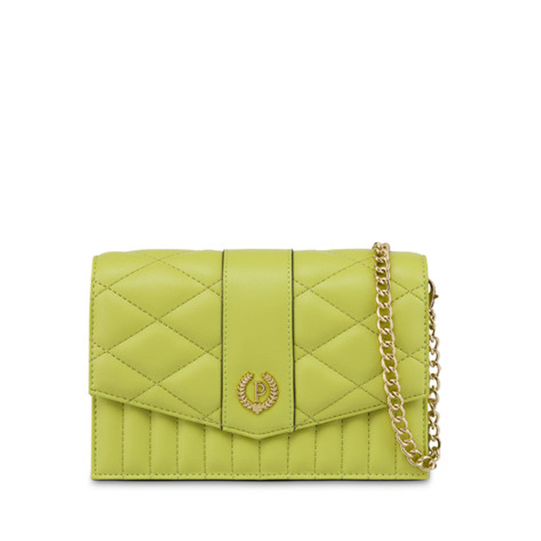 Versatile, practical and multifunctional clutch bag with matelassé workmanship. Removable chain for shoulder or crossbody carrying. Inside, it is equipped with a beauty mirror and card slots. Three internal compartments. Diamond matelassé combined with vertical cut matelassé Removable chain Metal P-laurel logo Magnetic closure 4 card pockets Lined interior Dimensions: 12X19X6