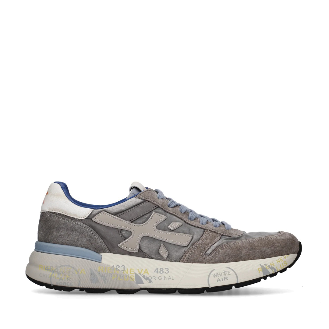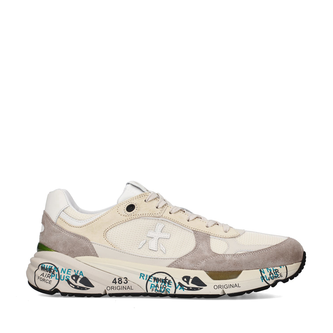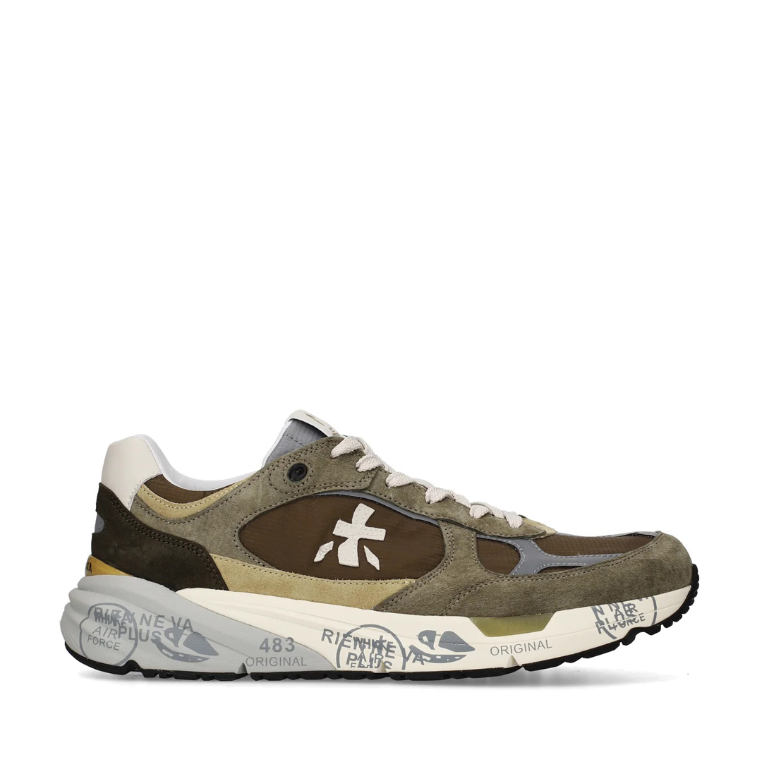 It is a men shoe that stands out for its retro, light and flexible style. Presented in leather, perforated on the tray and on the side, in dark green/taupe shades. Enriched by details that make it new, simple, but different. Look enriched by the unmistakable Premiata logo in white leather. Sole height 2.5 cm