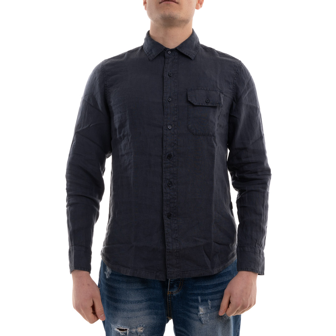 Men's shirt in garment-dyed pure linen, regular fit, classic collar, yoke on the back, one pocket with flap and button on the chest, REPLAY label on the side, cuffs with single button, rounded bottom, four-hole button closure.