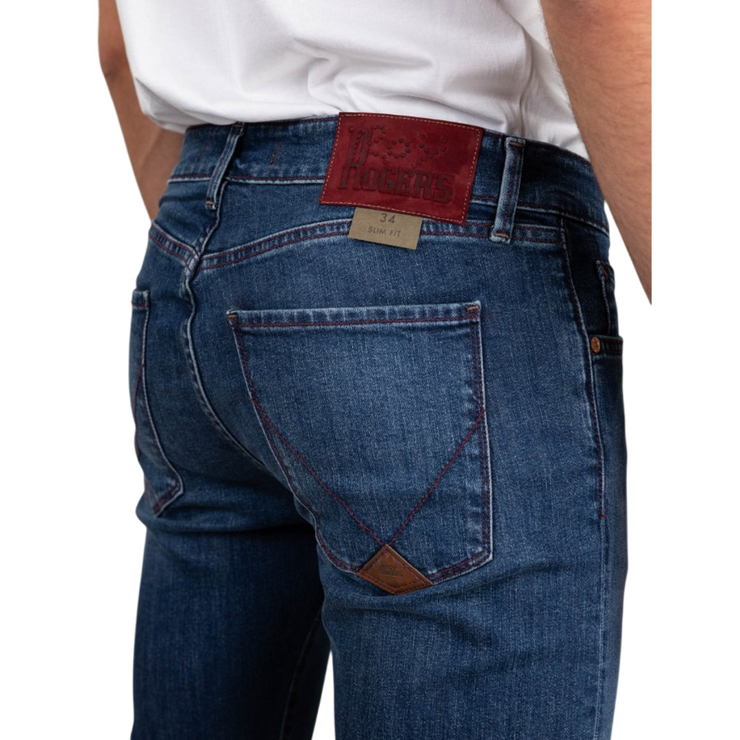 Roy Roger's denim jeans with a medium wash and light whiskering on the front. Mid-rise with belt loops and a label on the back. Zip and logo button closure. Slim fit.