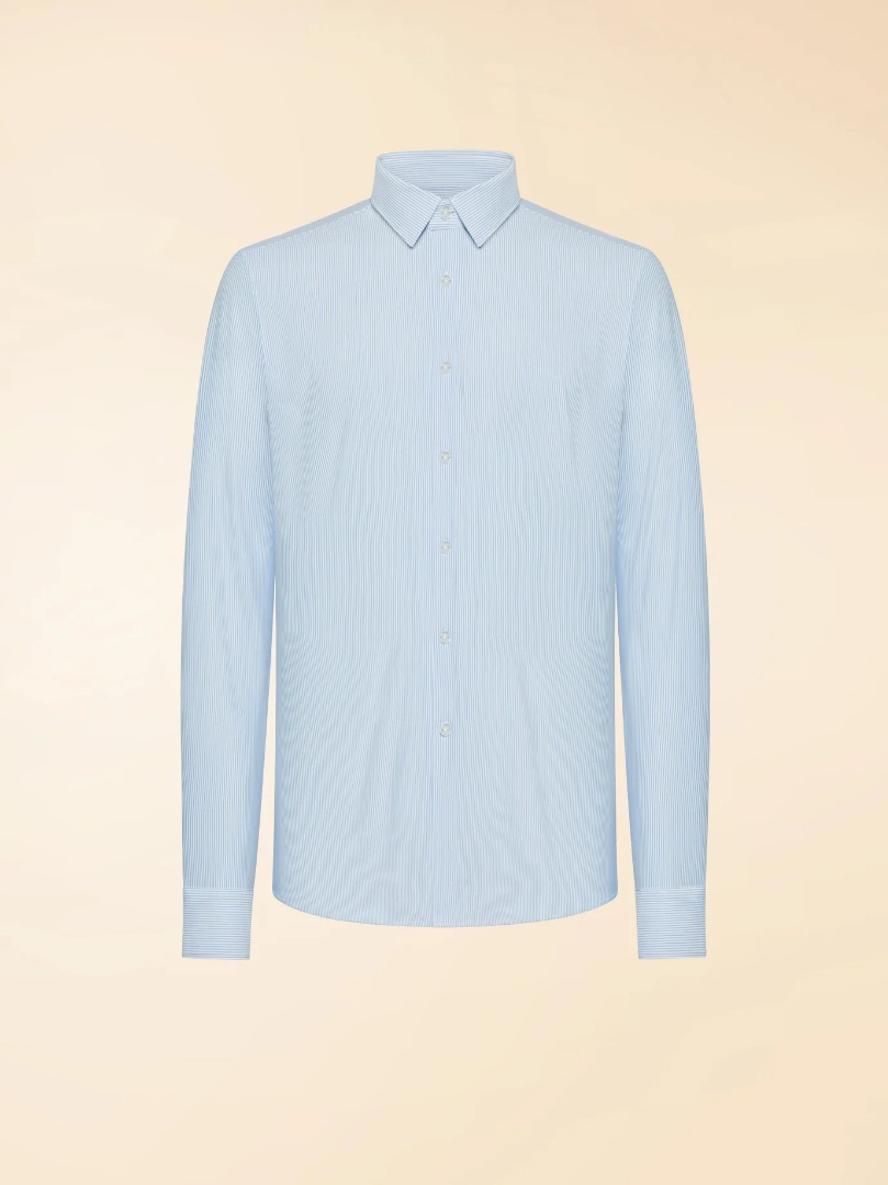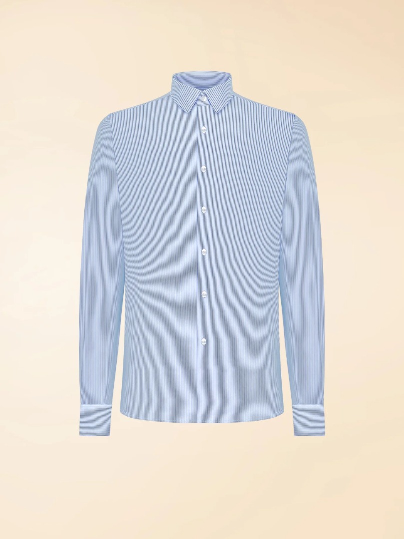 At the heart of the men's wardrobe, the vertically striped shirt remains a key style element, combining tradition and modernity. This open-collar interpretation refinement renews the language of smart casual and modern formal menswear. The regular fit enhances the silhouette with effortless harmony, while the fresh, breathable, and pleasantly textured stretch jacquard fabric features a blue stripe print on a neutral background that illuminates the texture and enhances its distinctive identity. The French placket, complemented by mother-of-pearl buttons on the cuffs, adds a touch of refined tailoring. The slightly extended back ensures an impeccable fit for every occasion. Perfect with a lightweight blazer or SURFLEX® chinos, the Oxford Jacquard Stripe Open Shirt interprets summer elegance with surprising ease. A timeless classic for a sophisticated style that renews the language of contemporary menswear.