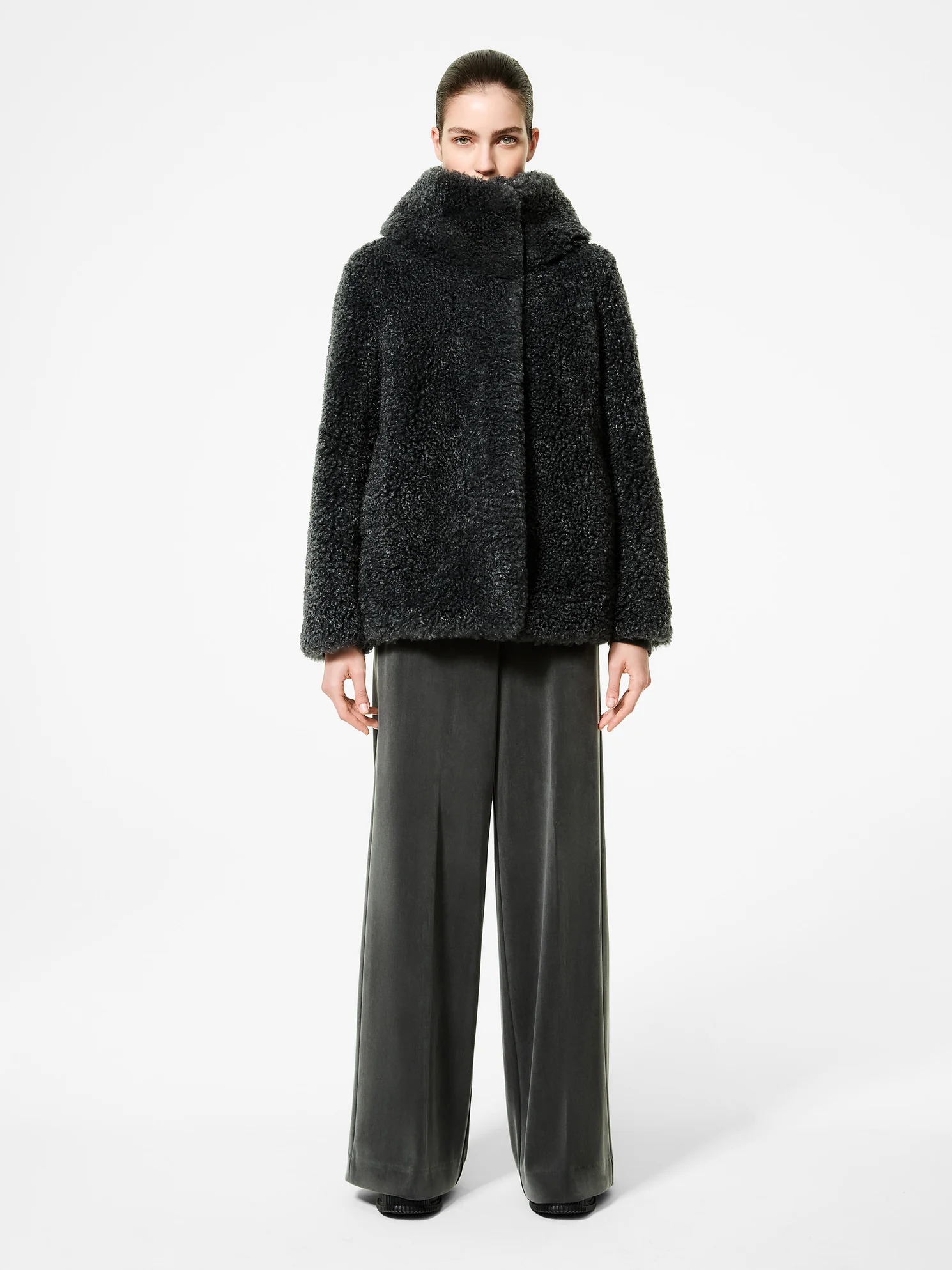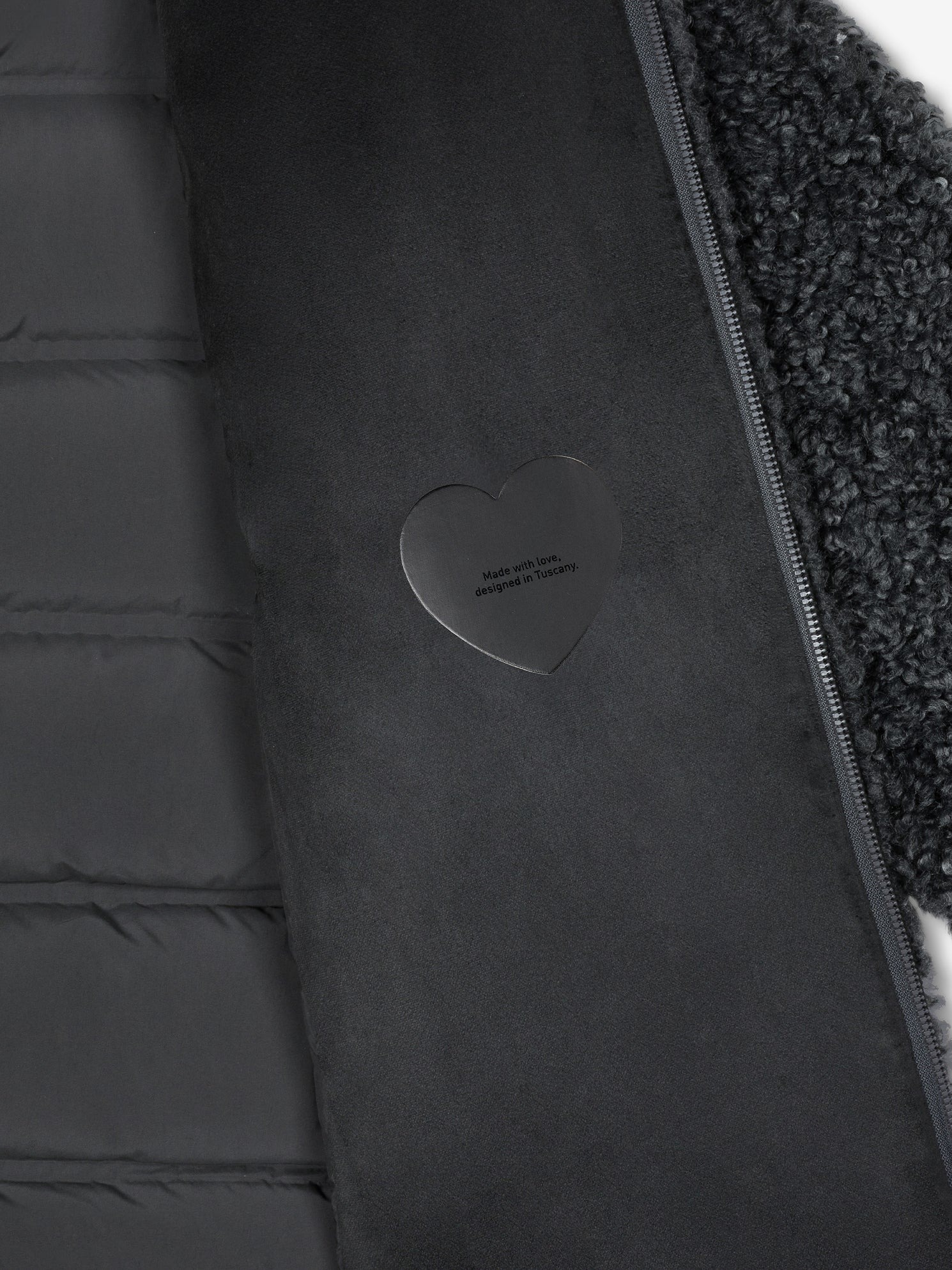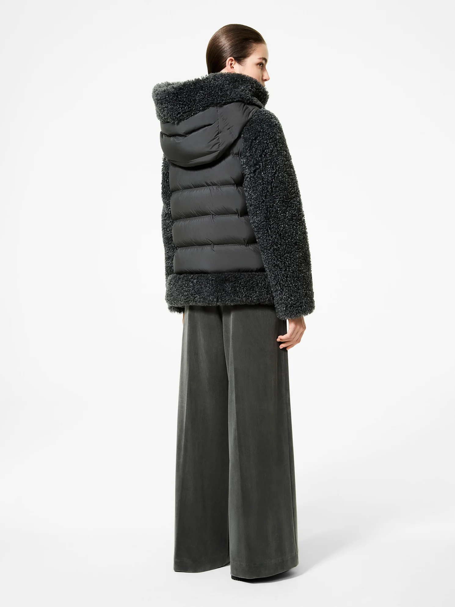 This versatile and distinctive outerwear piece stands out for its unique silhouette and construction of the front and sleeves, embellished with warm and enveloping faux teddy fur. The back features tubular channels containing the soft, warm duck down padding, offering exceptional comfort and lightness. The large, dramatic hood combines the two textures, enveloping the face and lending the design a unique and sophisticated allure. The hip-length design, invisible pockets, and concealed double-slider zip closure are the distinctive details that enhance its minimalist character and functionality. Perfect for a sporty-chic style, the Lamb Hybrid Hood Women's Jacket is the perfect way to elegantly face the coldest winter days.