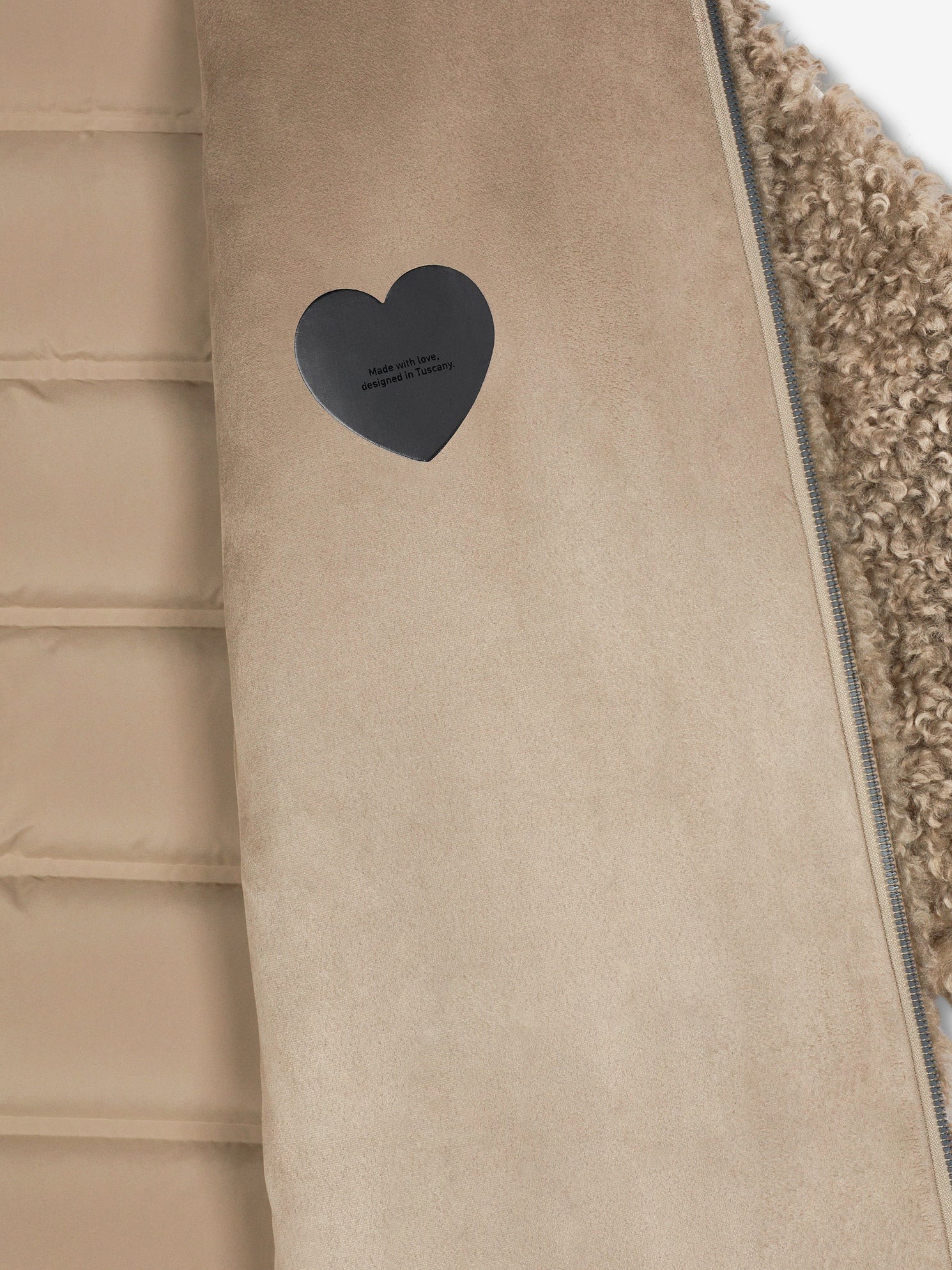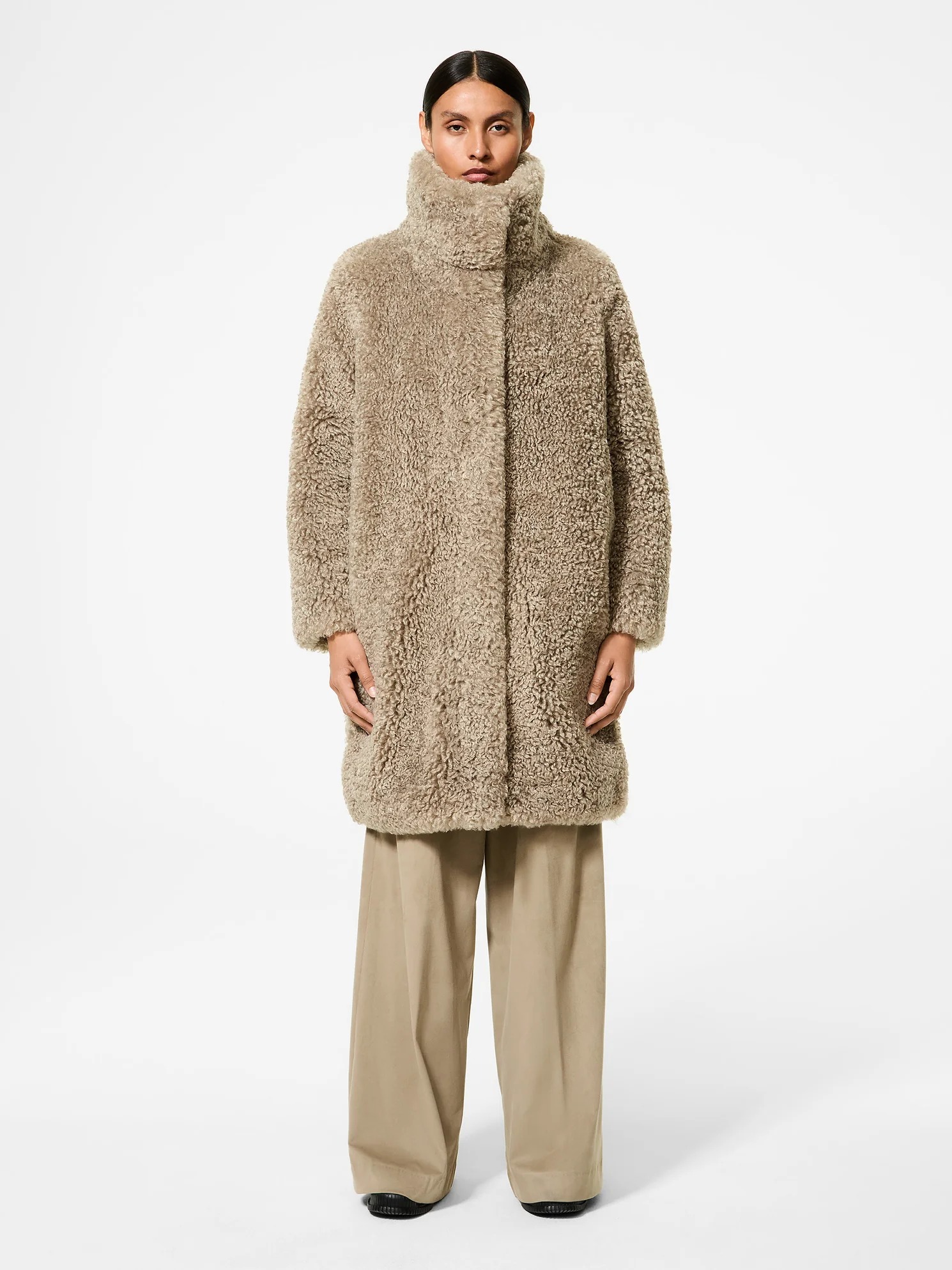This faux fur teddy coat stands out for its elegant silhouette and unparalleled comfort. The combination of materials, featuring faux fur on the front and sleeves with cozy, warm duck down padding on the back, gives the piece a versatile and trendy look. The high, enveloping collar is the distinctive design element that adds character and protection from the season's intense cold. Versatile and contemporary, the Lamb Hybrid Coat Women's Jacket lends itself to a variety of combinations to create unparalleled, glamorous looks. Ideal with wide, faux suede palazzo pants, the coat embodies a modern and sophisticated take on winter. The black micro-injected logo on the left sleeve subtly highlights the uniqueness of this winter must-have.